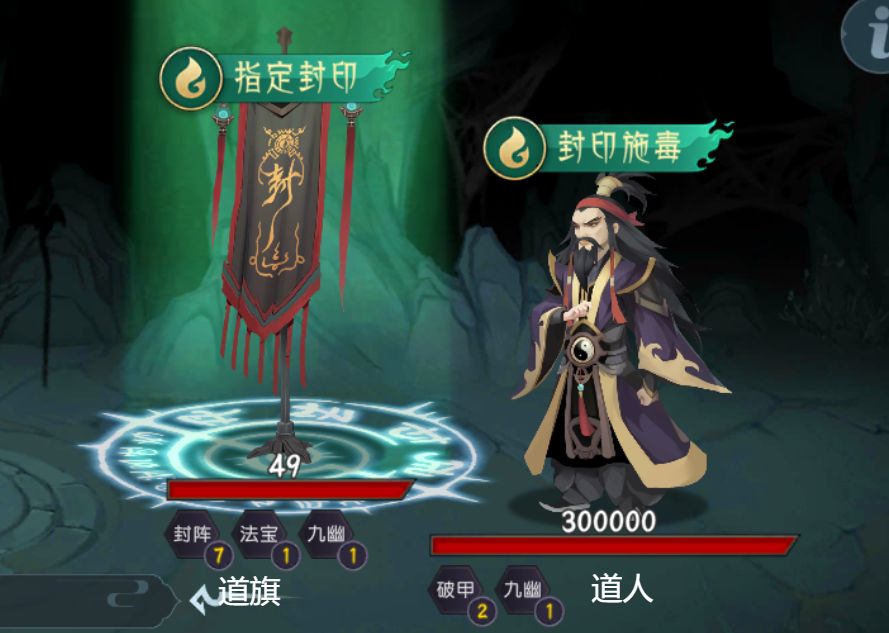 特别提醒:如果最后一回合不足以通关,记得先打道人再打道旗,因为道旗只有几十到几百血,计算伤害也是几十到几百,而道人基本上血量上亿,计算伤害也是按血量计算,打道旗会血亏很多伤害!!!