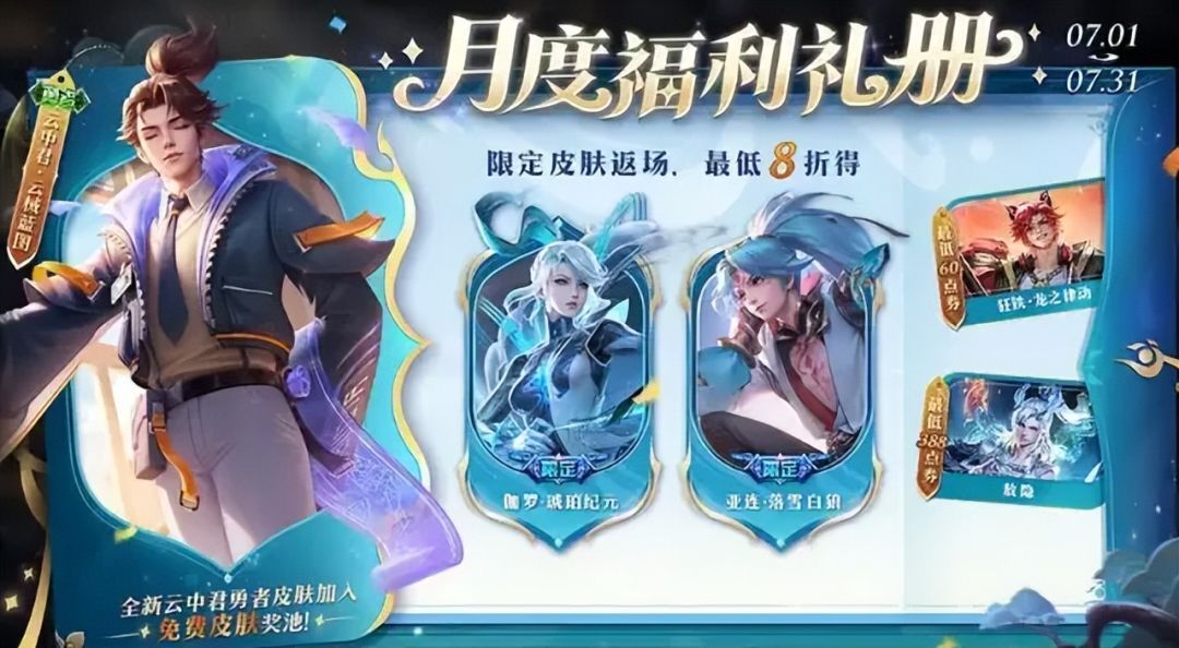 回忆礼册折扣:7 月 1 日 - 7 月 31 日,亚连 - 落雪白狼、伽罗 - 琥珀纪元最低 8 折。