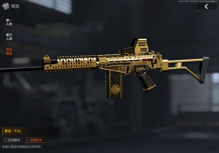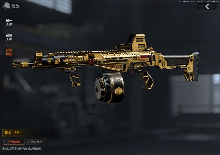 “黄金典藏”这一军需主要还是fal这款枪皮,其他的基本都是返厂的,fal的黄金皮检视很酷,且有两套方案第一款是打近战的,在自己手里是很帅的,则第二款是打中近距离的,搭配上整枪涂装手感好且非常帅