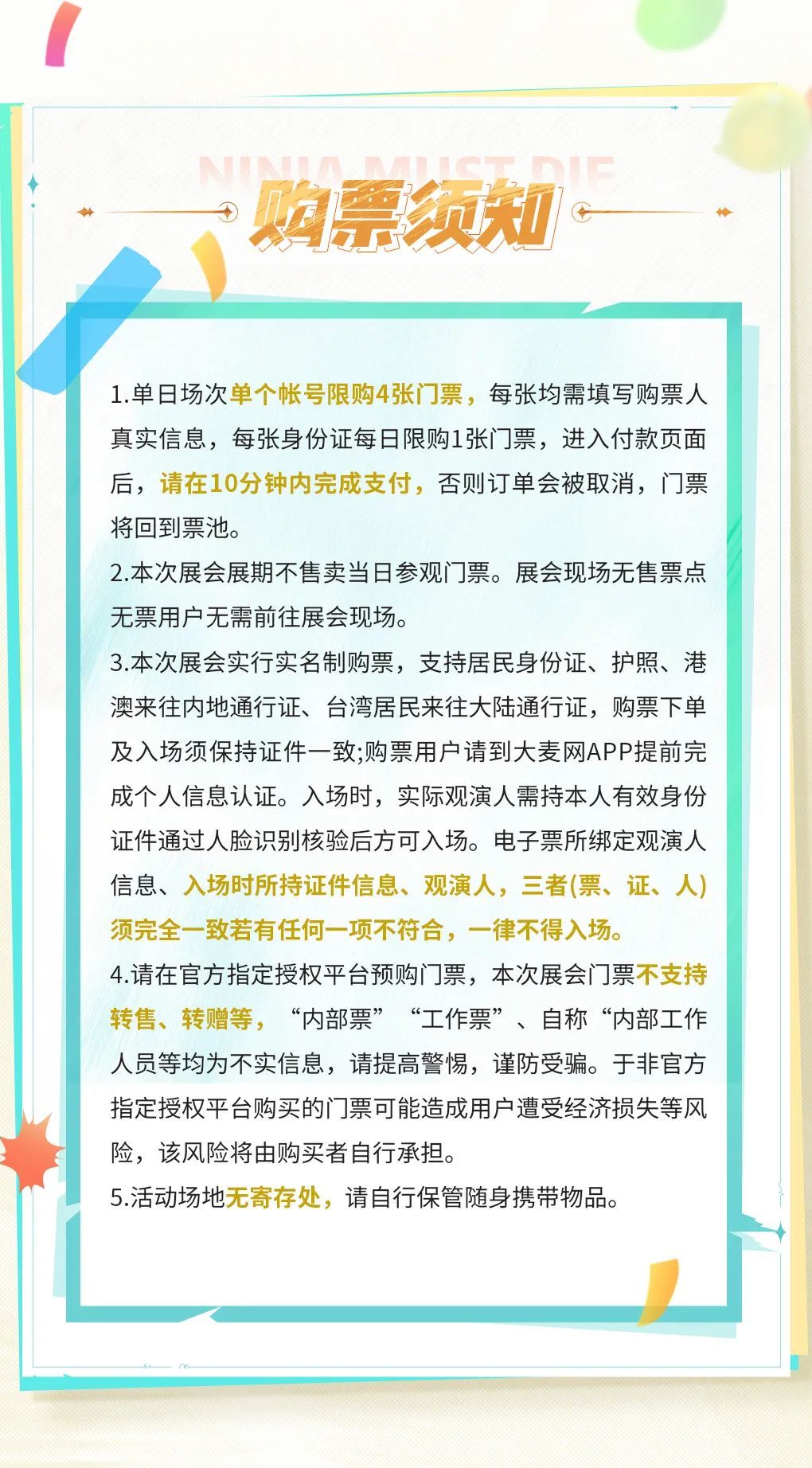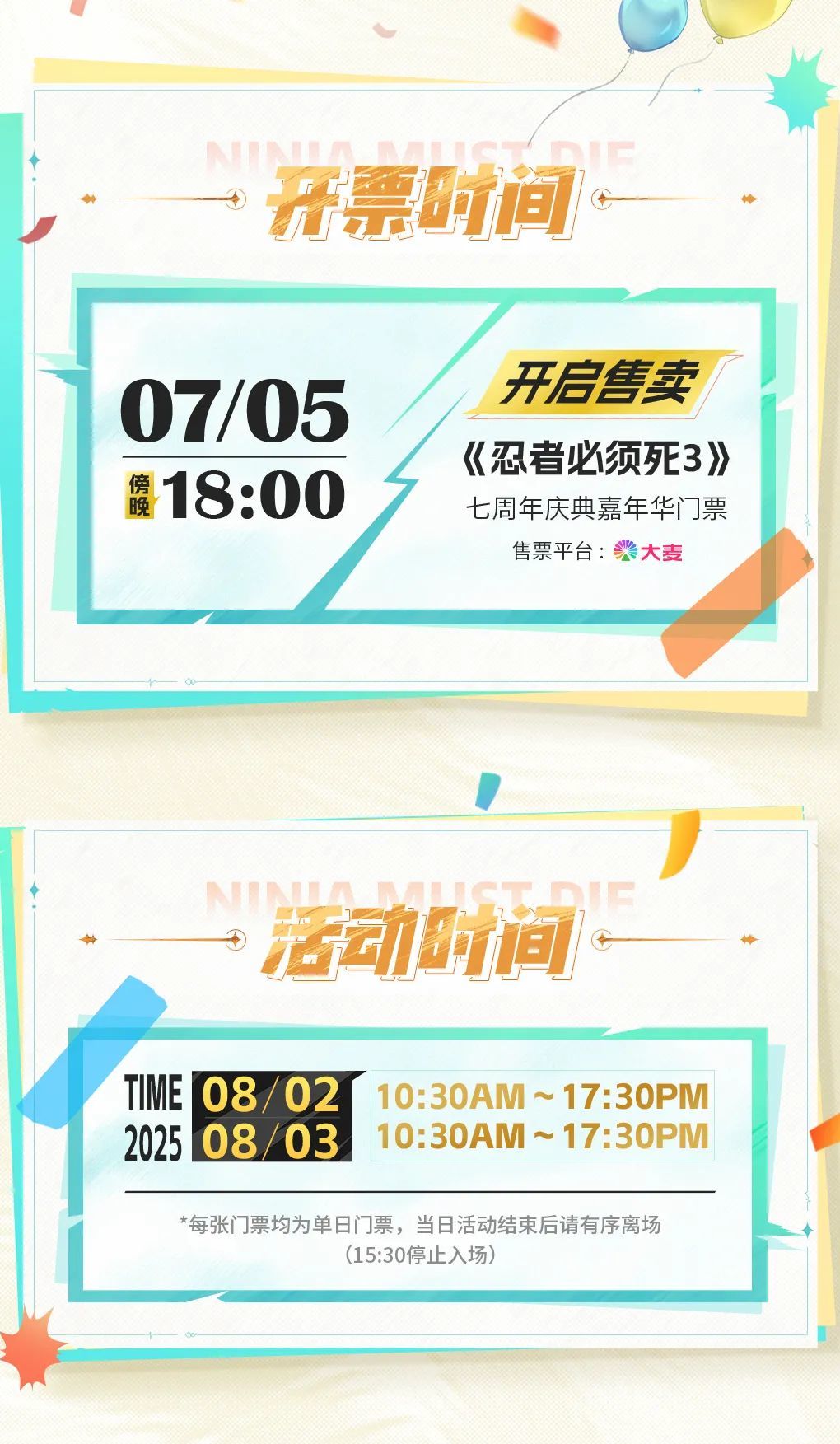 据官方发布消息,忍3七周年庆典嘉年华的门票为限量售卖,大家可以在大麦平台搜索“忍者必须死3”进入售票页面,从而进行「添加想看」和「预约抢票」操作!8月2日、8月3日两天的门票一共有1500份,数量有限,大家有想去的记得及时抢票。