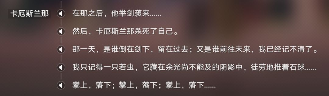 还有一点,第一次轮回中的白厄向卡厄斯兰那挥动武器,被贯穿胸膛的人眼睛里已经没有光,不知道是因为受伤还是这个就是卡厄斯兰那(轮回的白厄),卡厄斯兰那也自述(p6)他杀死了自己,但究竟是谁倒下了谁前往了未来,他也记不清,,,或许在四百万次轮回的时候他提出的由当前的「白厄」杀掉轮回的卡厄斯兰那在第一次轮回中就已经实践了