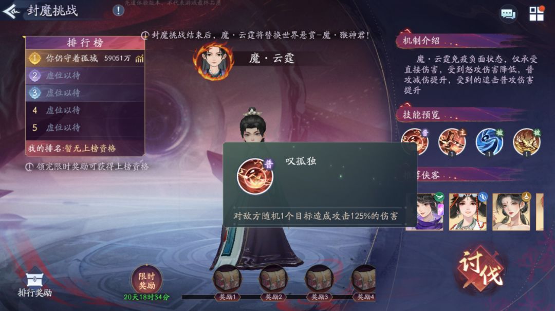 根据封魔挑战魔·云霆的特性,建议大家使用带有追击普攻特性的侠客上场挑战