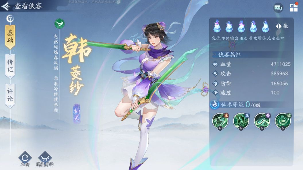专属5:摘星效果强化,友方侠客普攻行动后,韩菱纱有75%概率立即释放普攻,且摘星效果触发的后续追击附带目标最大生命值7%的真实伤害(不超过韩菱纱攻击的300%)