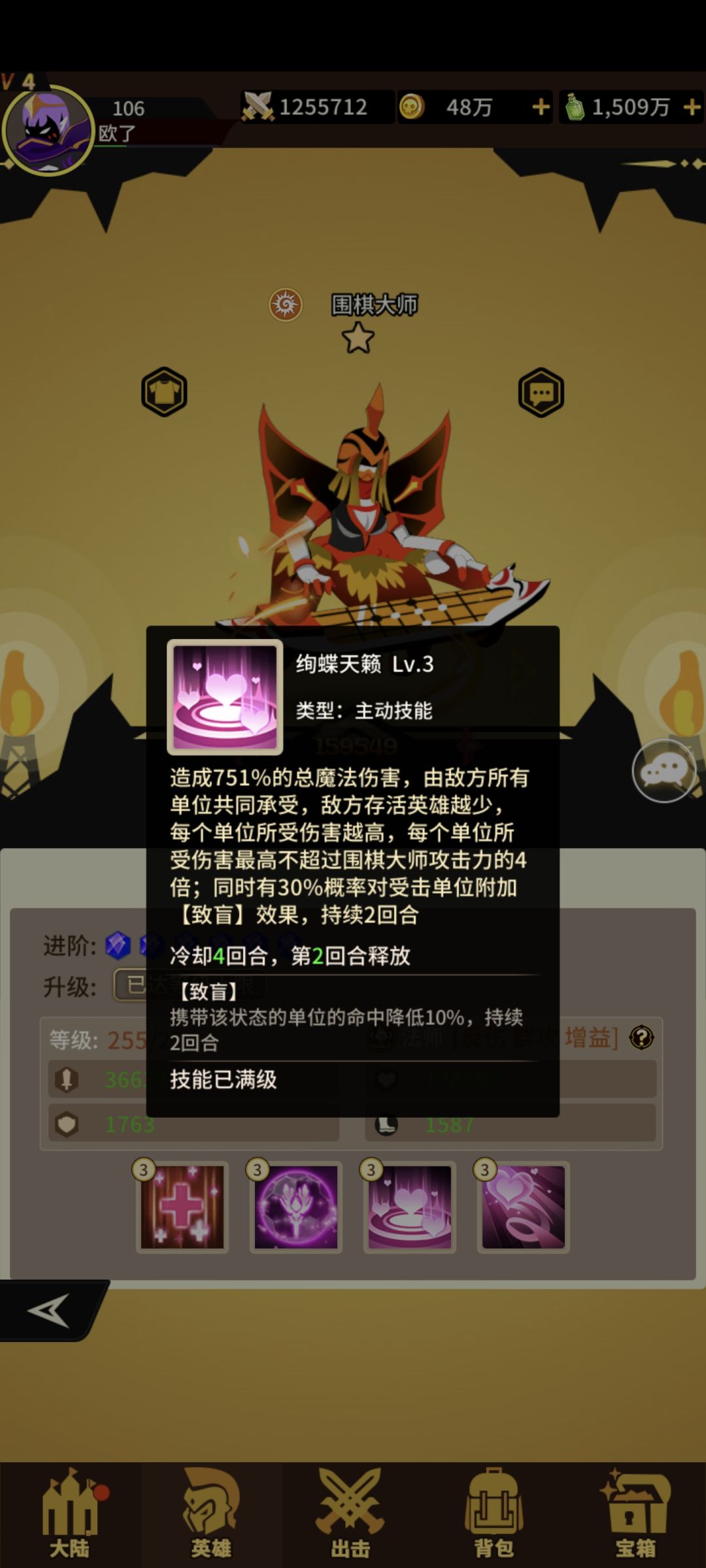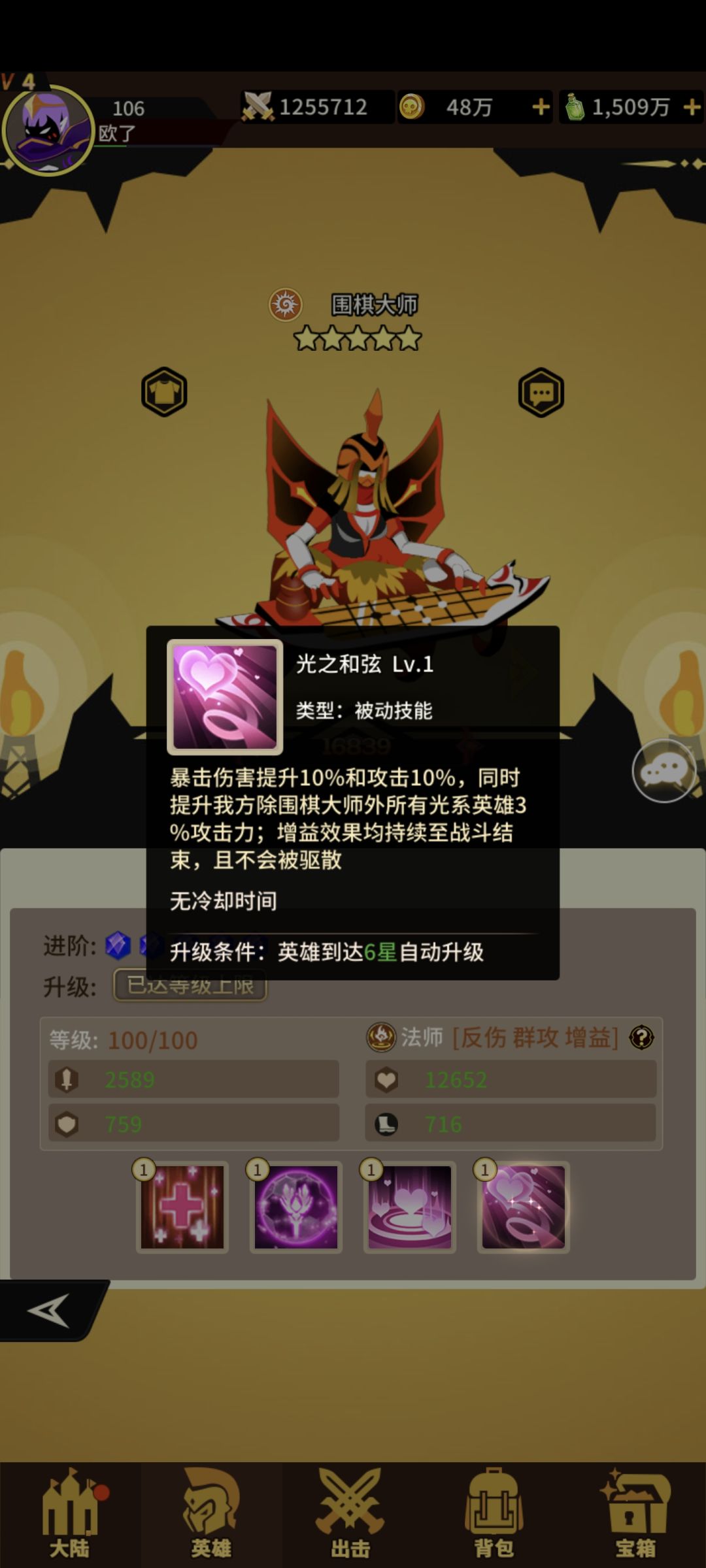 光系法师围棋!获取难度 难!抽卡看脸!宝箱看脸!不欧就老实的兑换吧!一技能打敌方攻击最高两个+伤害加深!二技能+攻击+生命+暴击三技能敌方共同承担最高不超过琴魔四倍伤害!存活越少伤害越大!满级还有概率致盲(减少命中)四技能+爆伤+攻击给所有光系队友+攻击