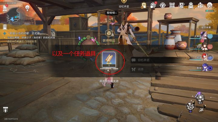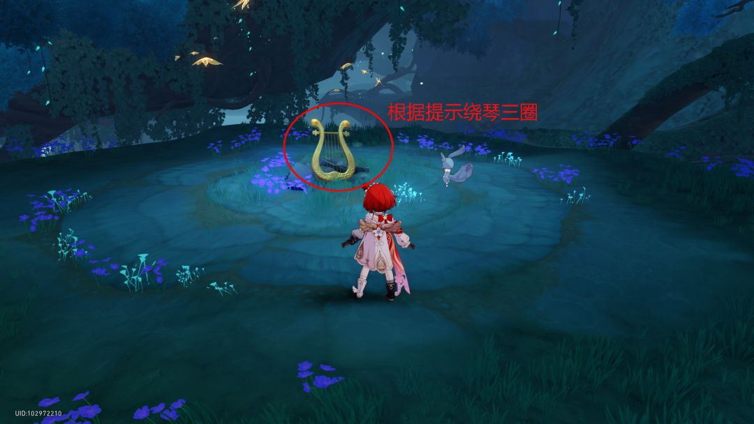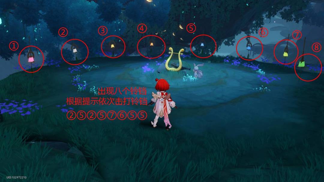 根据指示来到图片中的位置,再根据道具提示绕琴三圈,会出现八个铃铛。从左到右依次为八个铃铛标数,按照25257655的顺序依次击打铃铛,出现宝箱。