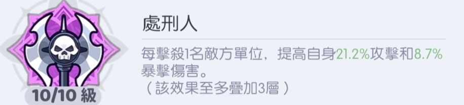 猫女作为奥术队唯一需要手操收割残血的角色,带【处刑人】可以弥补后期伤害不足的缺点,还可以打断敌人奥义提高队伍上限,另一个【假面怪盗】在猫女暴击率低的时候可以带。