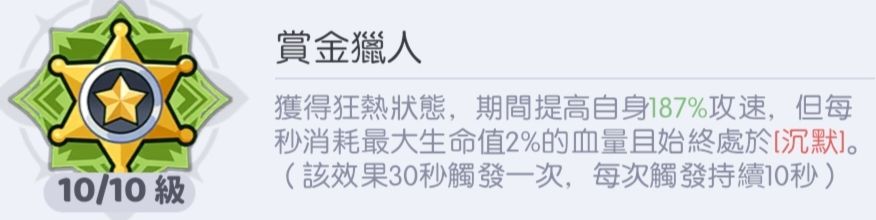 - 好处:自残加快回怒并且加攻速,早进入狂野状态可以早拿到600暴击,这600暴击不仅可以提高幻影剑触发概率让伤害更稳定,还可以提高小技能暴击概率,小技能暴击又可以回怒,让荆保持更久的狂野状态或快速进入下一次狂野状态;加攻速的好处则是可以更好的利用0.2秒的内置CD,如果攻速低七级天赋收益会减少。对暴击率要求比光明游侠低一些,因为赏金猎人可以回怒,回怒可以更早进入狂野状态,后续循环会比较流畅。不需要去升级赏金猎人,一级即可,方便我们以后切换光明游侠不浪费职业材料。