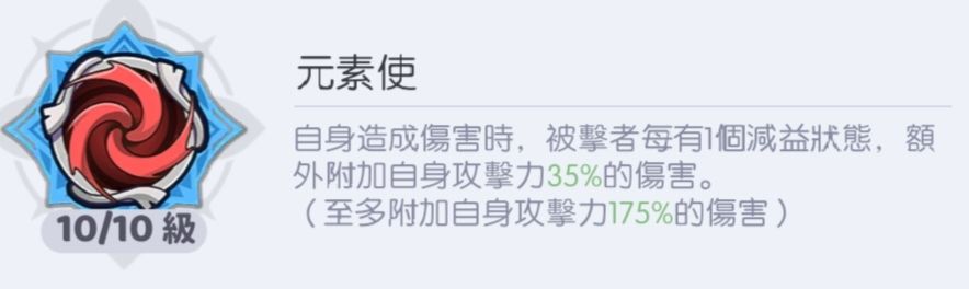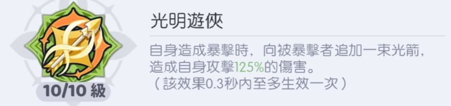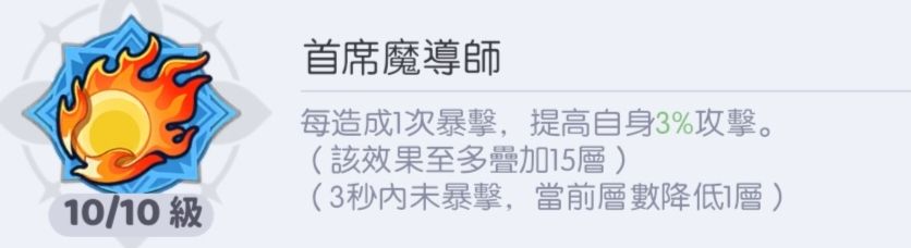 炎魔所有攻击造成伤害的时候可以附加伤害,【光明游侠】最适合炎魔的职业,炎魔本身释放奥义导致她出伤特别频繁,带【光明游侠】进一步提高了她的伤害。由于要暴击才能生效,所以炎魔的暴击率也是需要保证的。
