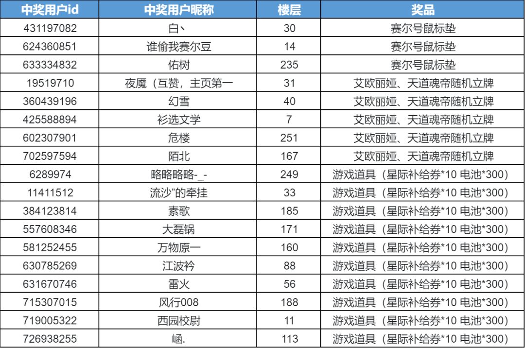 7月9日全新玩法「太空探索计划-铸魂塔篇」等你挑战 活动开奖啦!感谢大家的热情参与!!让我们恭喜以下获奖的赛尔们!(鼓掌!~(‾ ⌣‾~)