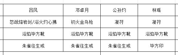 第一回合:开局打出林瑶的燎原决,接着再吃蓄力丹,然后观察火灵气分布,在火灵气时打出林瑶的战意决,如果涅槃咒在上面就不打,公孙灼打出百战心法,吕风复制百战心法并打出。
