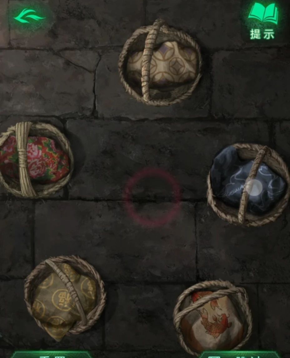 还是来说游戏吧,有点怀疑这个盲老太是男人配音的,总有一种夹着嗓子的感觉,可以自由行动之后先看一眼右下角,五个竹篮对应地上五个图案,将竹篮都放在对应图案上即可,最上面是铜钱,左上角花,右上角鸟,左下角福,右下角鱼,放好后如上图,分别在右上角竹篮拿到【木头哨子】,左下角竹篮拿到【火柴】,最上面竹篮拿到【木头手枪】。