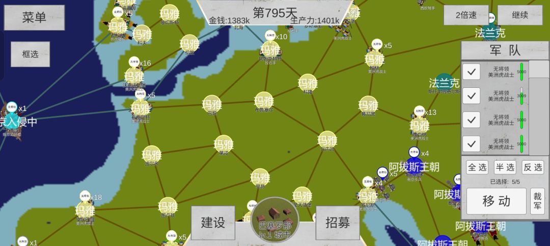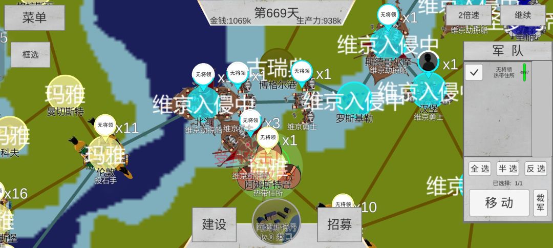 ①开局切换2倍速,直接跳到34天,那个时候燕军正在功打大唐,先在尤可坦等一个骑兵,开局把美洲用3骑兵拿下,等到129天