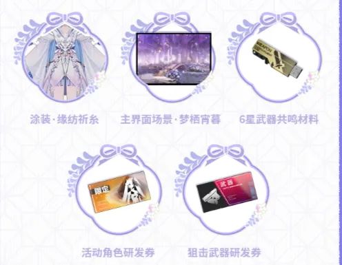 2500角色研发券、2500武器研发券、1个武器共鸣材料、赛琳娜·希声皮肤、主界面背景。每抽有1%概率获得特殊奖励,每20抽保底一个。