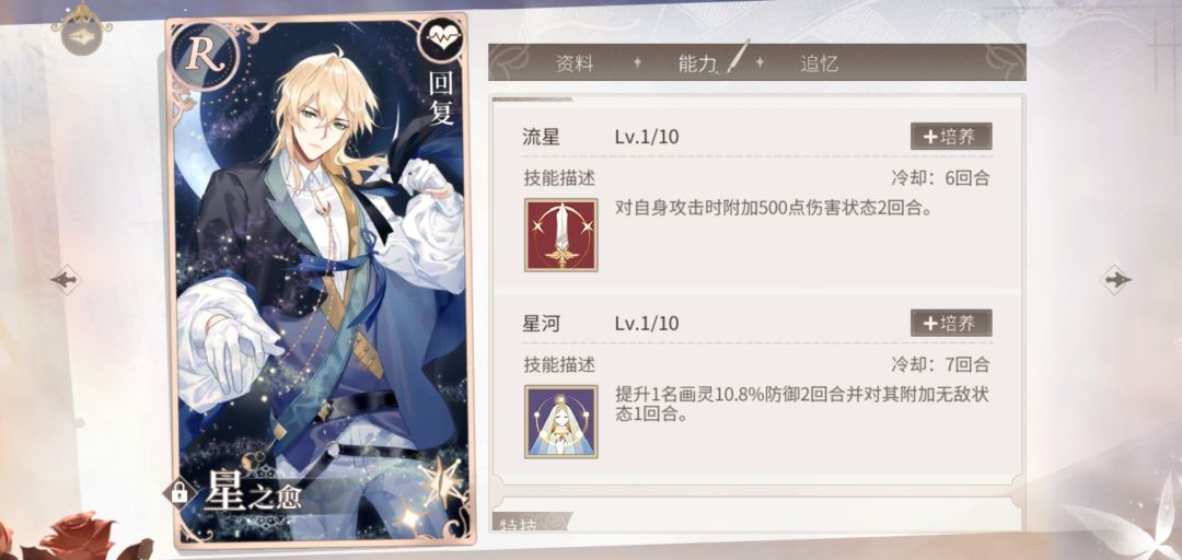 我本来以为闪避是概率的,结果是必定闪避。闪避跟无敌的区别,仔细翻了翻,闪避不能闪一些词条带必定命中的技能,无敌会被一些词条带破除无敌的技能打到。两个都不免疫毒伤流血这些回合后伤害,而且理论上都属于增益,可以被驱散。(比如艾因的那张囚笼卡)绘旅人的战斗系统设计的很复杂,有点战法牧内味。可惜一个乙女游戏不会出太难的战斗副本,所以这些相对应的效果也就没啥卵用,显得有点多余。反正只要等级够高,高到平a秒人,总能过的。