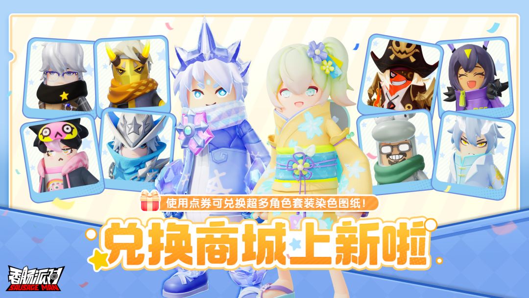 更新之后肠肠可以在商城中,找到兑换商城使用点券兑换多款全新的角色套装染色图纸!
