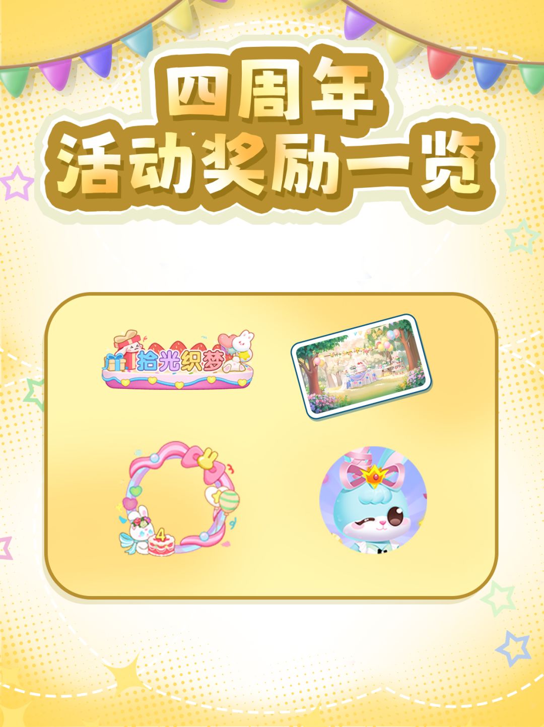 四周年活动预计将于7月份中旬开启,这就给您先爆料一下!😆实物周边等泡泡下期揭晓~