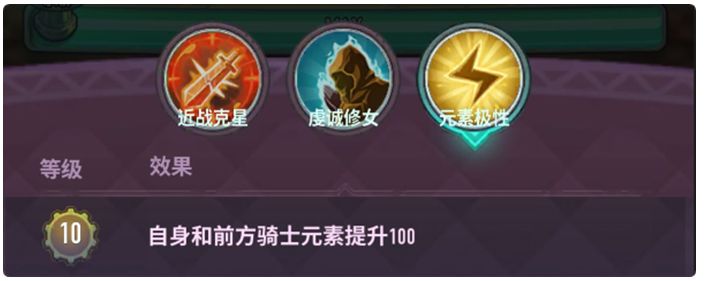 【元素极性】:自身和前方骑士进入战斗获得元素提升BUFF,该元素加成为基础元素加成,受百分比词条加成放大实际属性