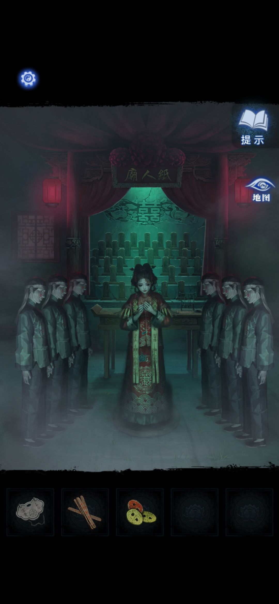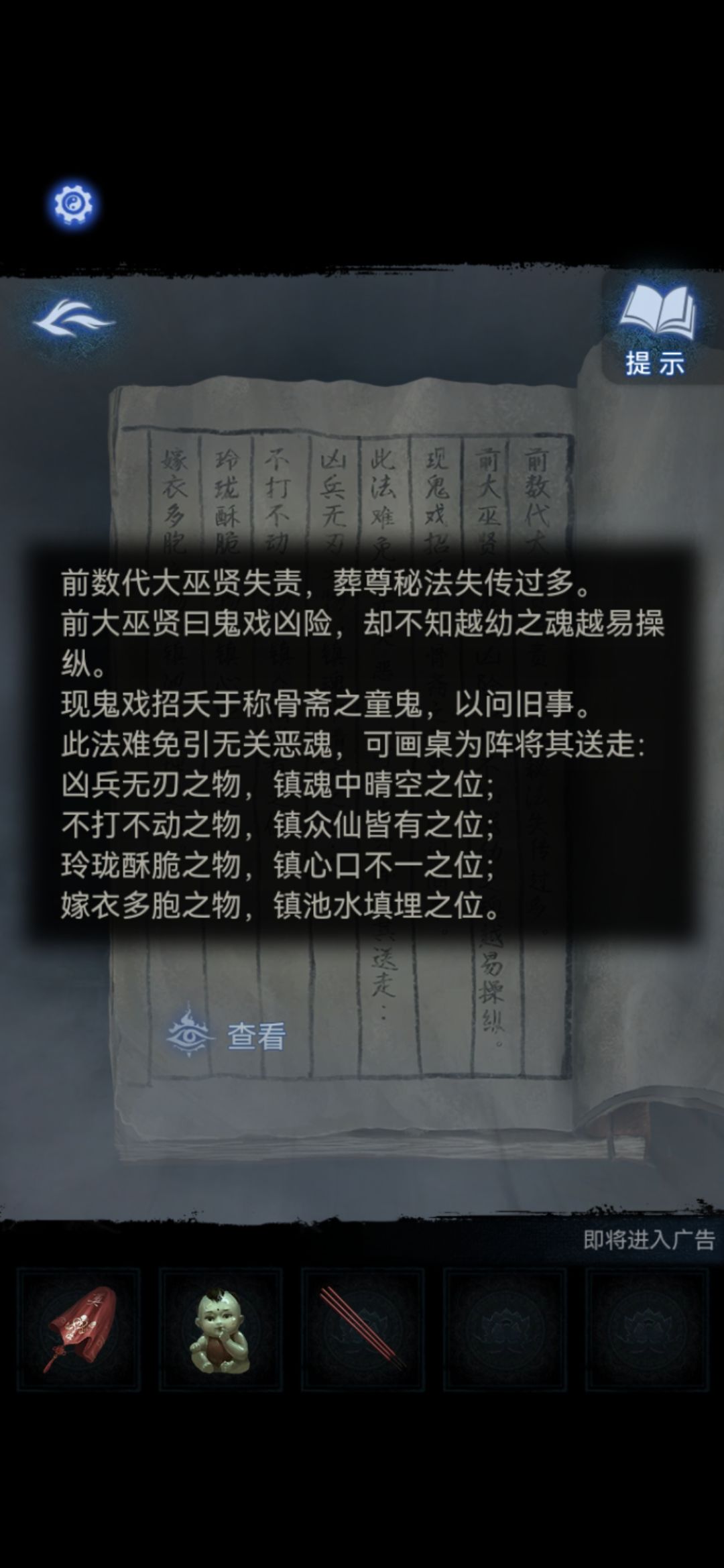 6. 剩下的解密就很简单了 那个秤砣上记得放小孩娃娃 拿了朱砂和碎木板记得找姐姐对话 对话完姐姐给的木牌子能打碎六藏菩萨 很牛 进到最后一个地方之后 场景右边的轿子可以把魕娘子的盖头给他 拿到梳子 魕娘子给咱们三个铜钱 还是在字谜的地下室那边 那个大磨盘算卦 得三个卦象 记住他们的颜色 回到最后一个场景 在头上的几个牌子里 有一个长命百岁 把道具的长命锁挂上去 按照6个卦象的红黄顺序把左边的棺材打开 杀了六藏菩萨就还阳了。