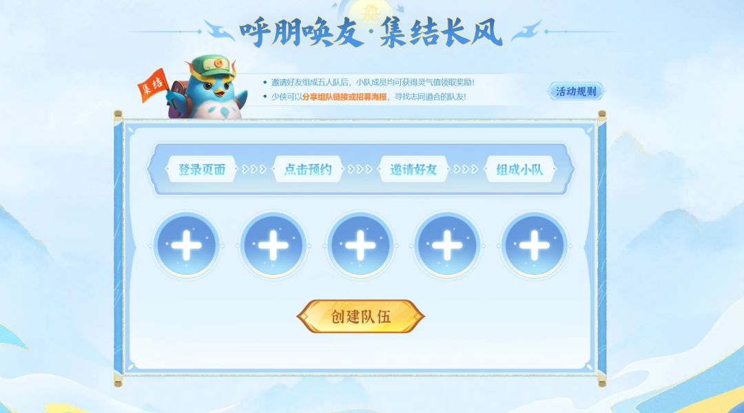 分享组队链接或招募海报,寻找志同道合的队友!邀请好友组成五人队后,小队成员均可获得灵气值领取奖励!