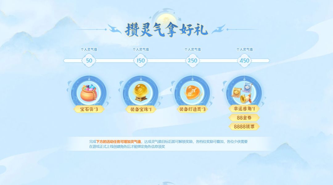 少侠通过完成每日任务、个人任务以及预组队可以获得灵气值,当灵气值达到一定进度时可以获得对应奖励。