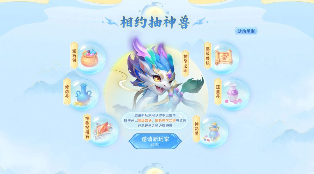 活动期间,少侠邀请新玩家完成预约可获得幸运兽角,打开幸运兽角概率获得高级兽诀、随机神孕之卵等奖励,开启神孕之卵必定获得神兽!