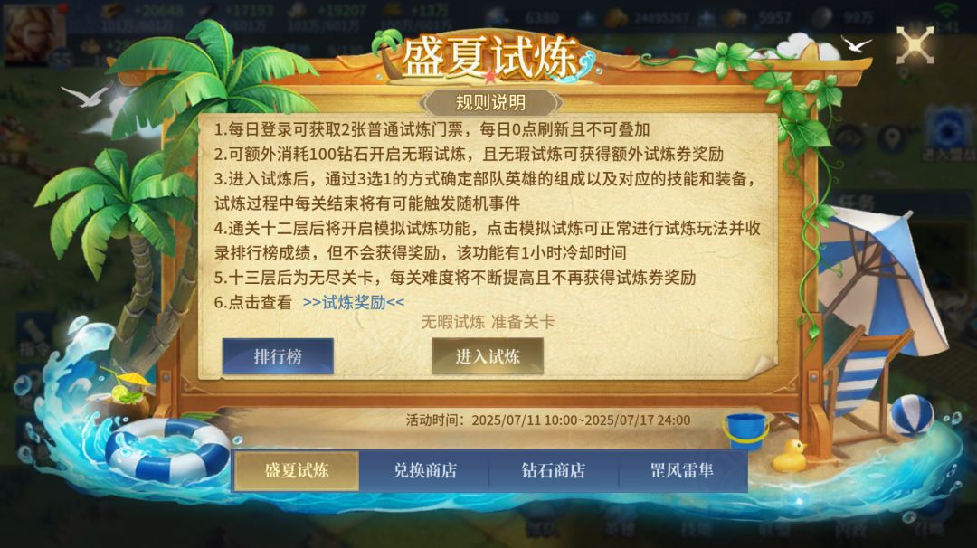 ①活动期间可消耗门票道具开启盛夏试炼玩法!每日登录游戏即可获取普通试炼门票,钻石商店可购买无暇试炼门票,使用无暇试炼门票开启试炼玩法可获得额外奖励~
