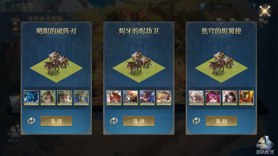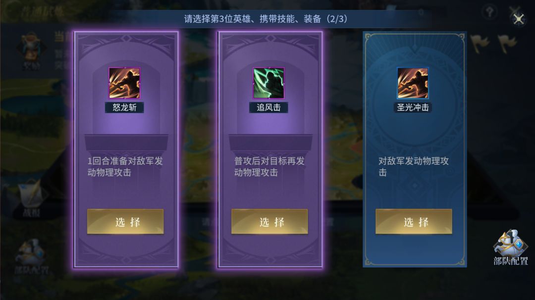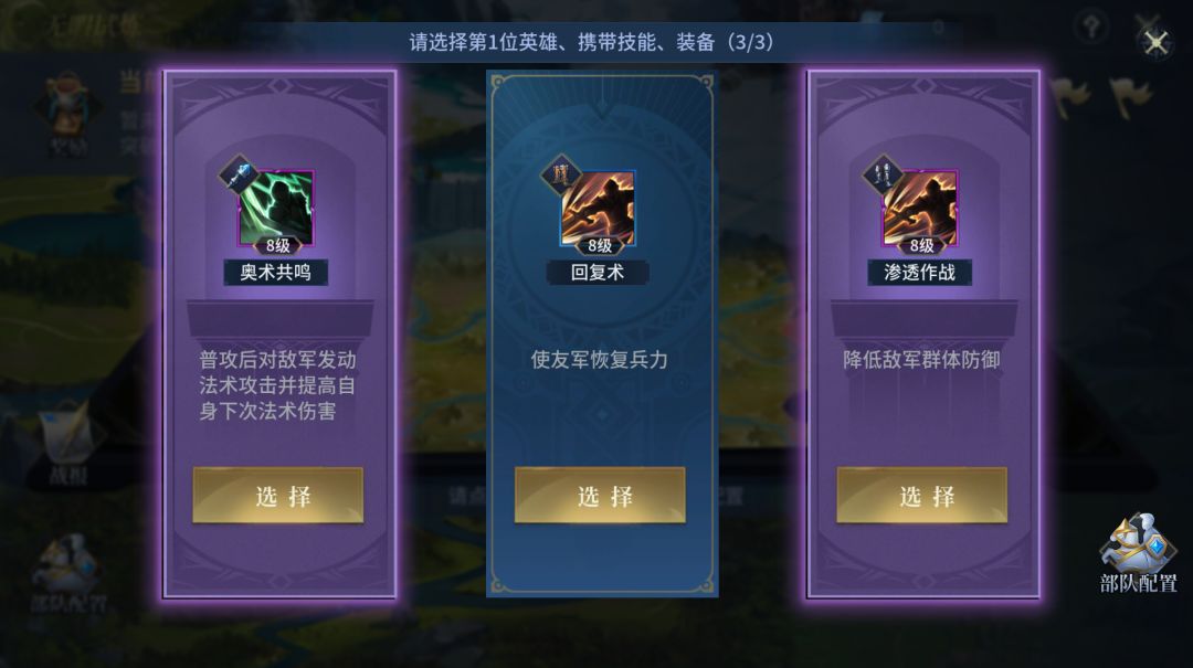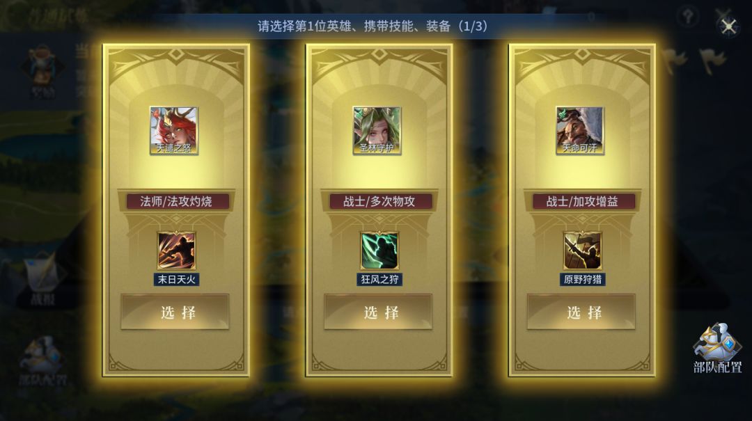 ②进入试炼后,需依次通过3选1的方式抽取选择英雄、技能、装备来组建自己的试炼部队。