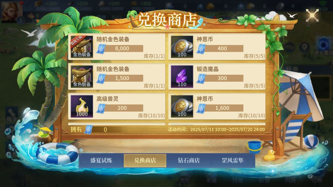 活动期间,将限时开放兑换商店,可使用通过盛夏试炼玩法获取的试炼券兑换金色装备、召唤卷轴等超值道具!