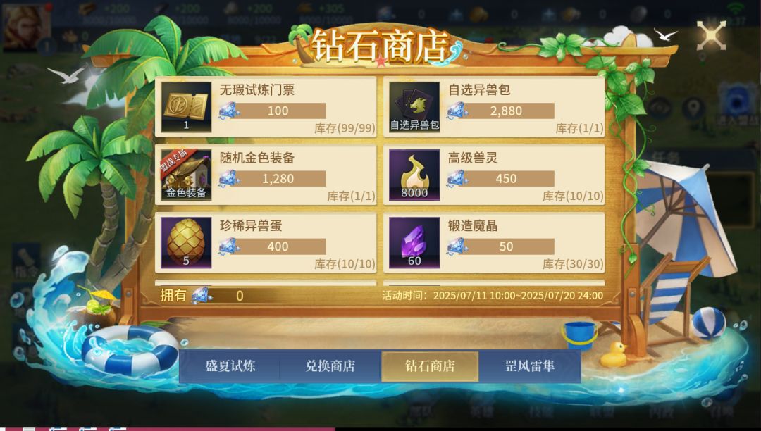 活动期间,将限时开放钻石商店,可使用钻石兑换自选异兽包、金色装备等超值道具!