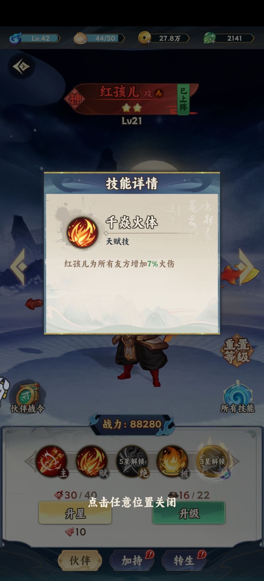 红孩儿,被动增加友方7%火伤。其实从战场表现来看,红孩儿非常废材,我带他纯粹是为了凑奥义。菩提剑法作为打boss利器也是可以带的,然后济公跟吕洞宾都需要菩提剑法来升奥义(虽然我吕洞宾还没三星)。主线就不谈了,多人本升级很难,基本只能出两个奥义,这个时候就要有所取舍。我考虑的是后期用巨灵神替换李靖,这样用旋风斩打小怪,菩提剑打boss,然后李白,吕洞宾,巨灵神,济公四个bb都可以升出奥义。这大概是目前为止的最优方案了。后期红孩儿换后羿,梼杌等