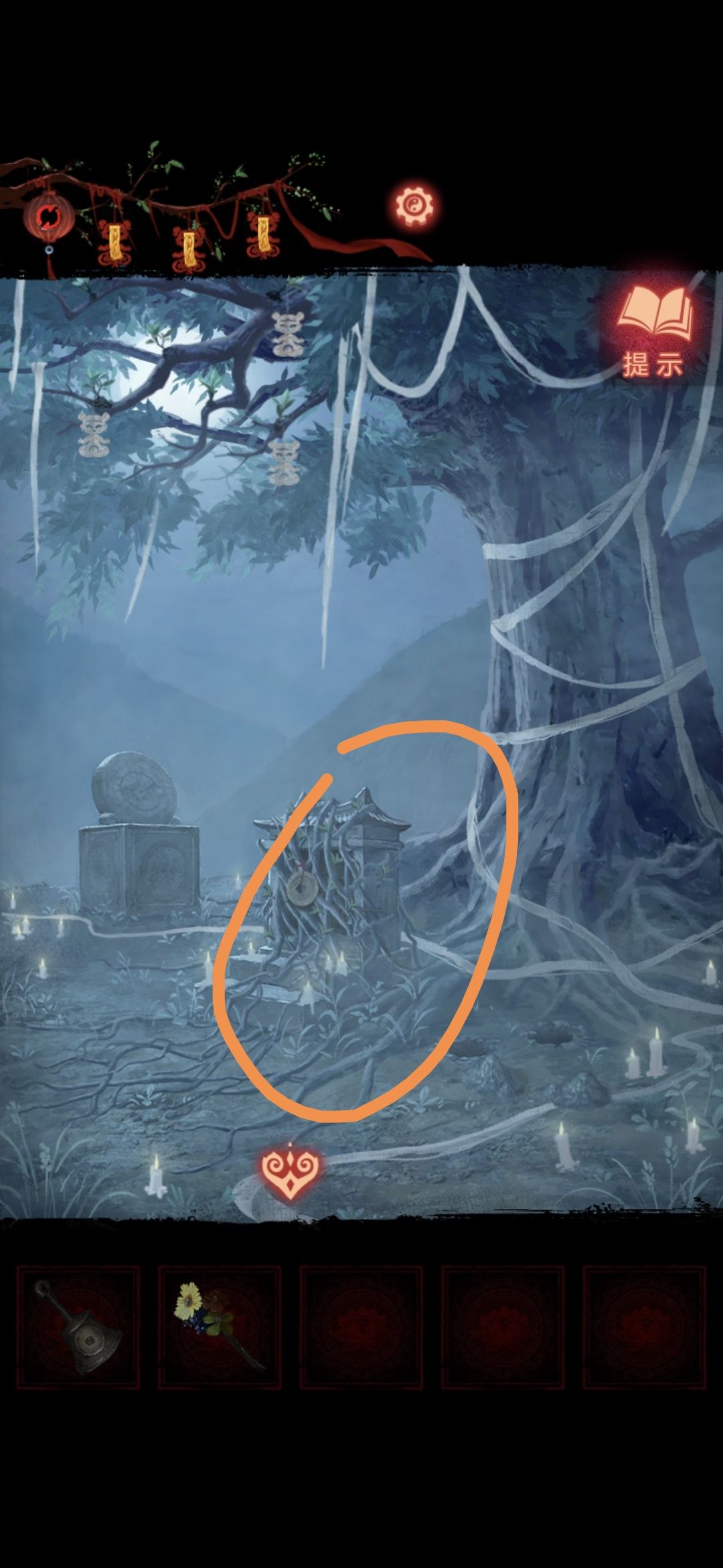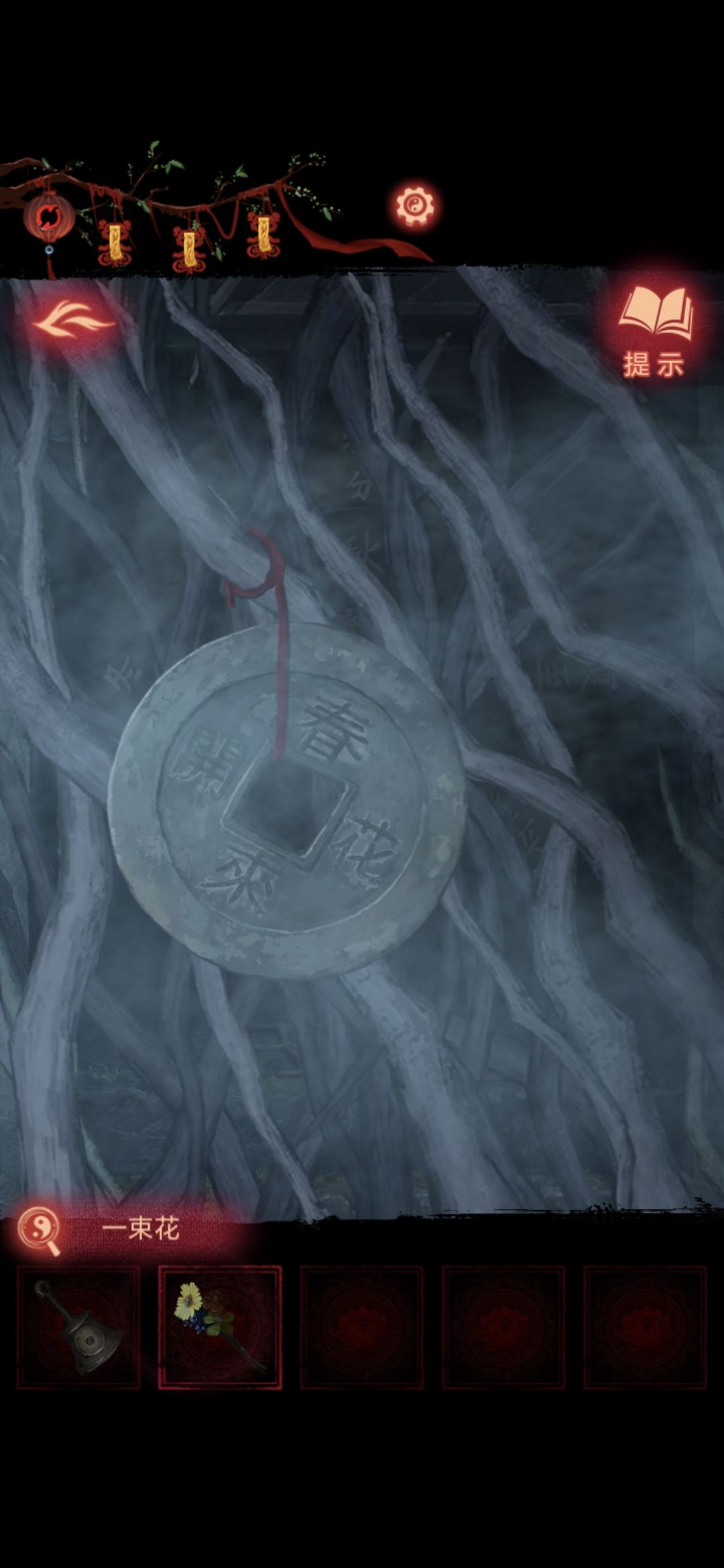 切换莫黎视角,将一束花插在巨大铜钱里,获得古怪树枝