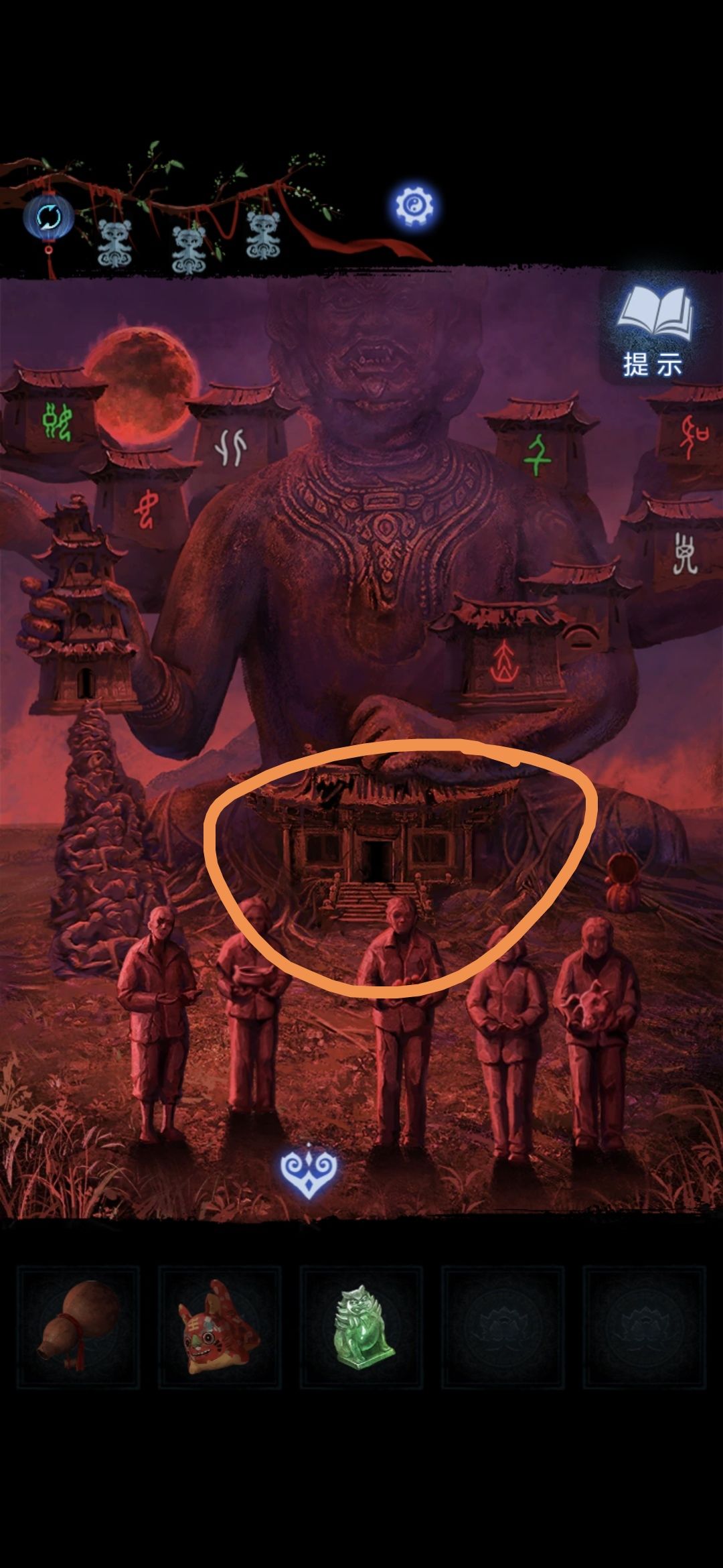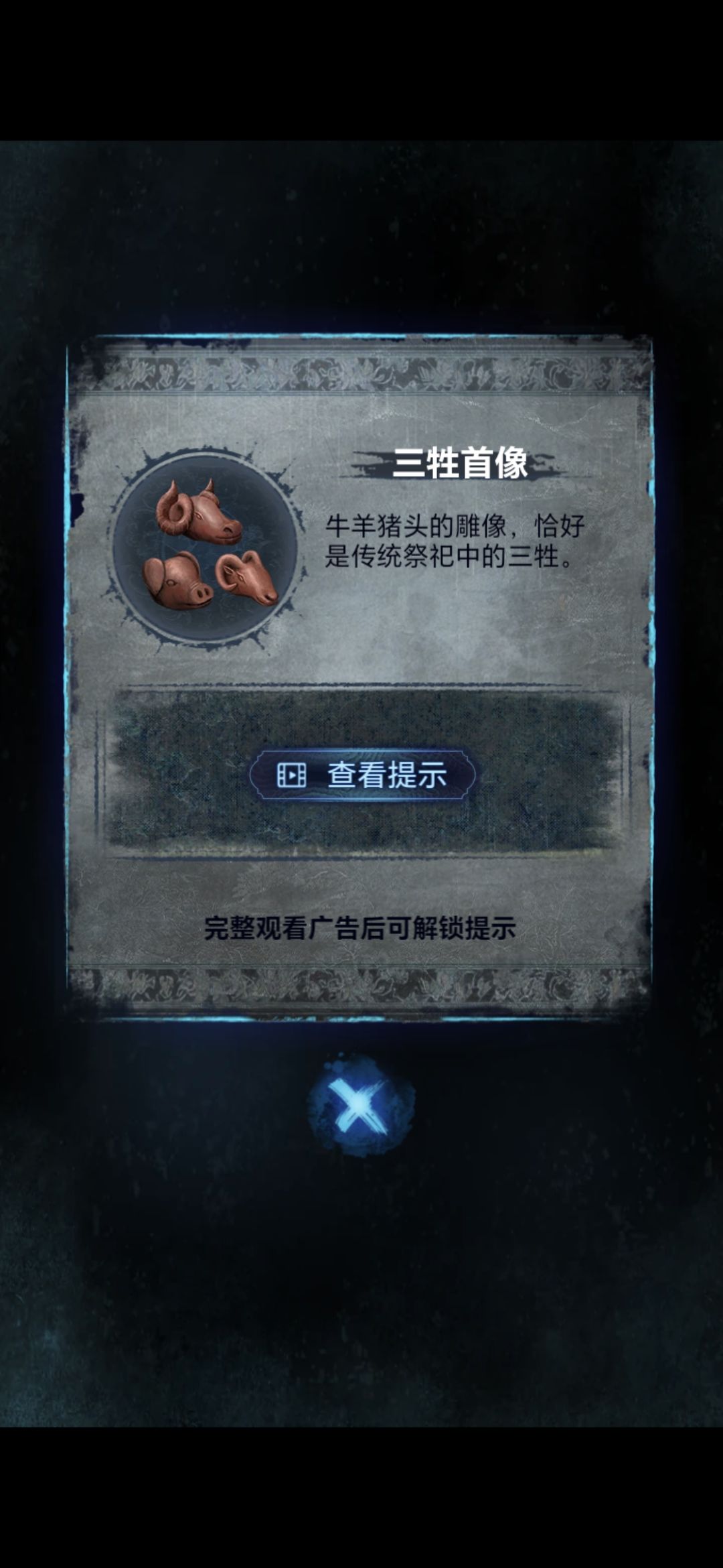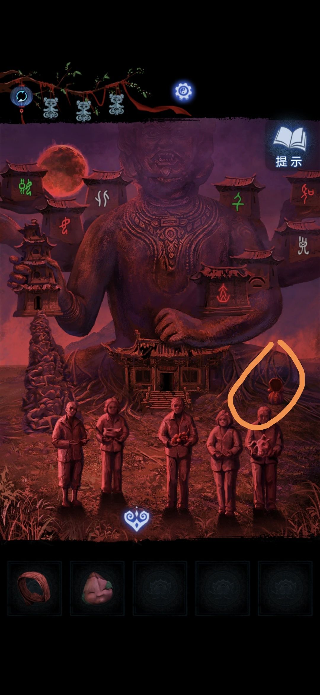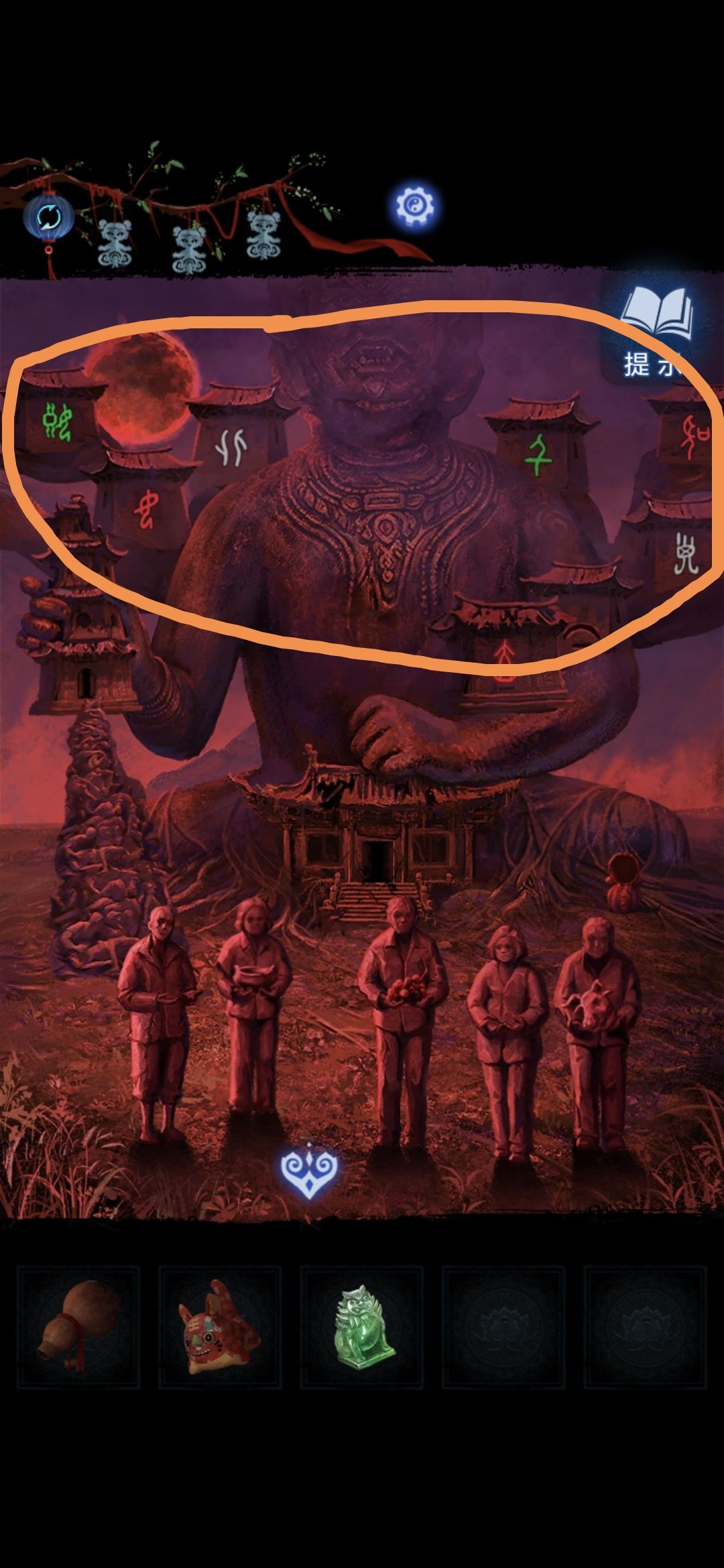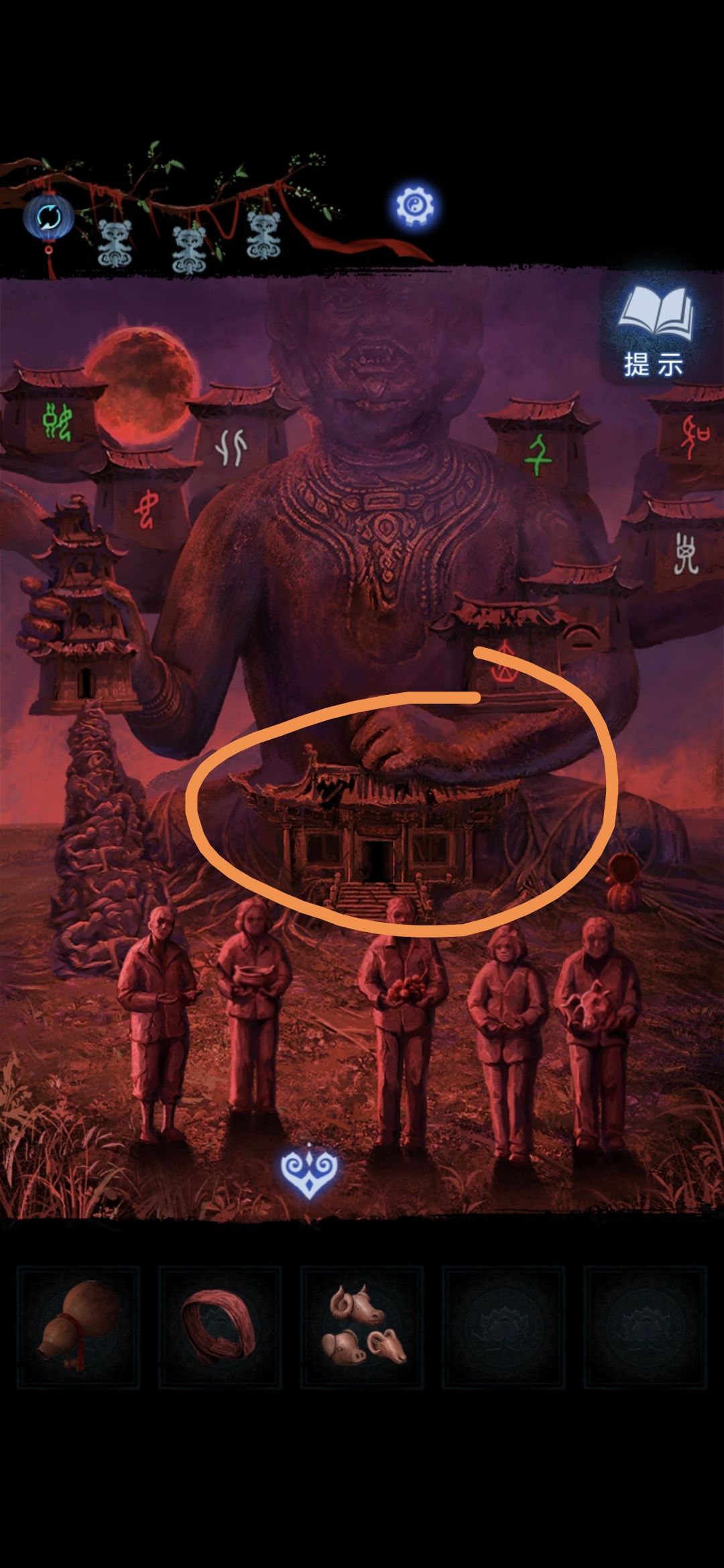 切换莫琪视角,进入塔中,将铜币放在神像群中,根据莫黎视角大钟铃铛上的图案顺序敲击神像,敲完获得三牲首像