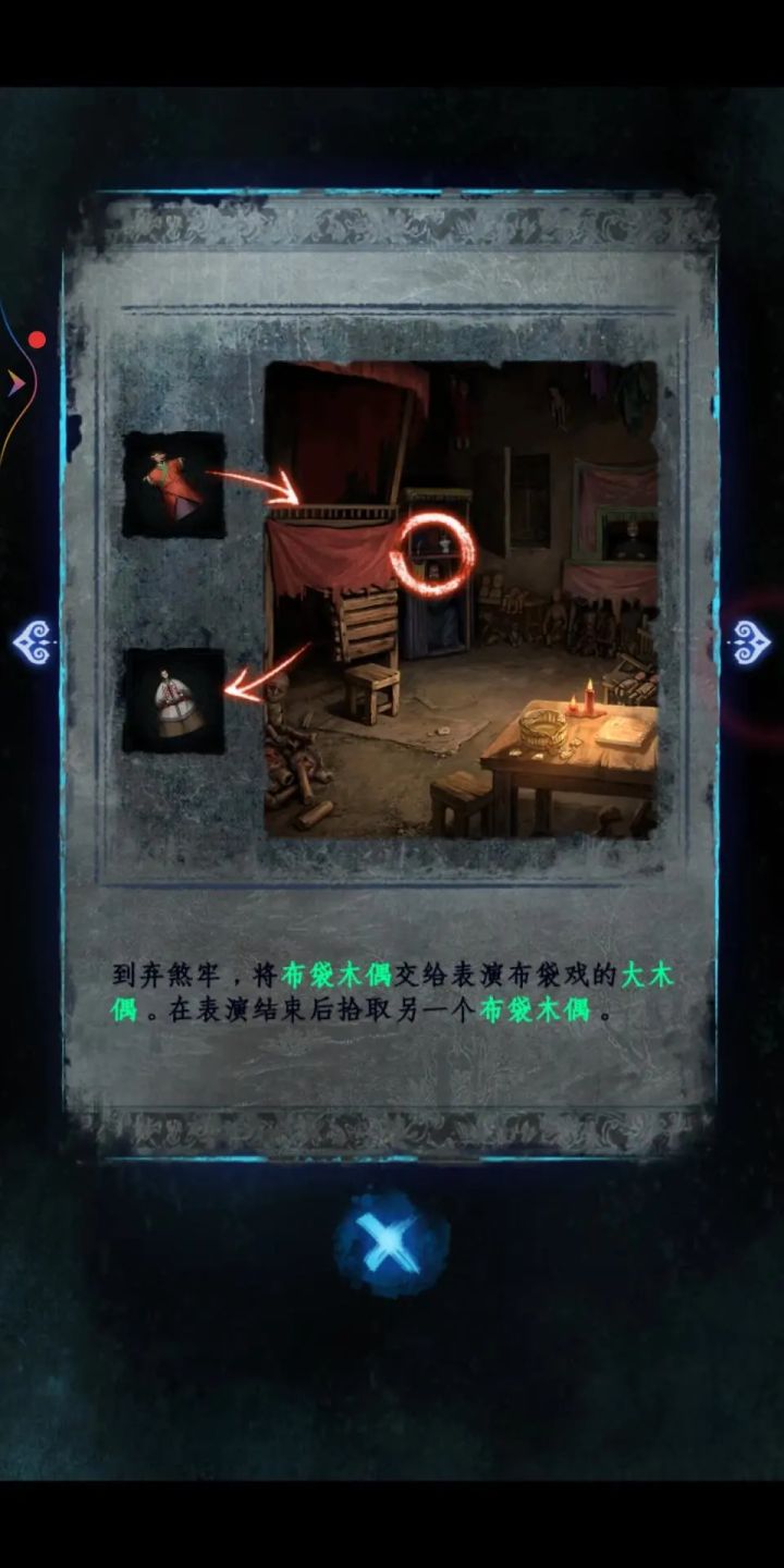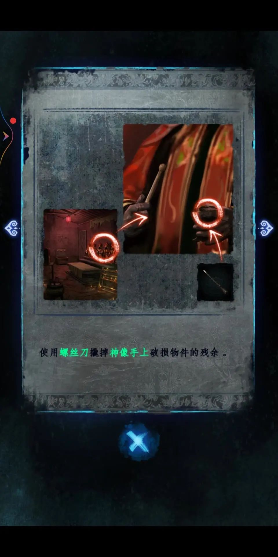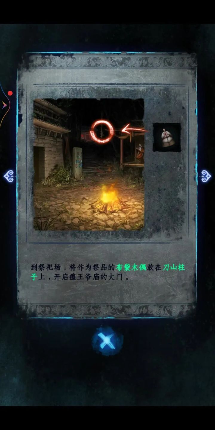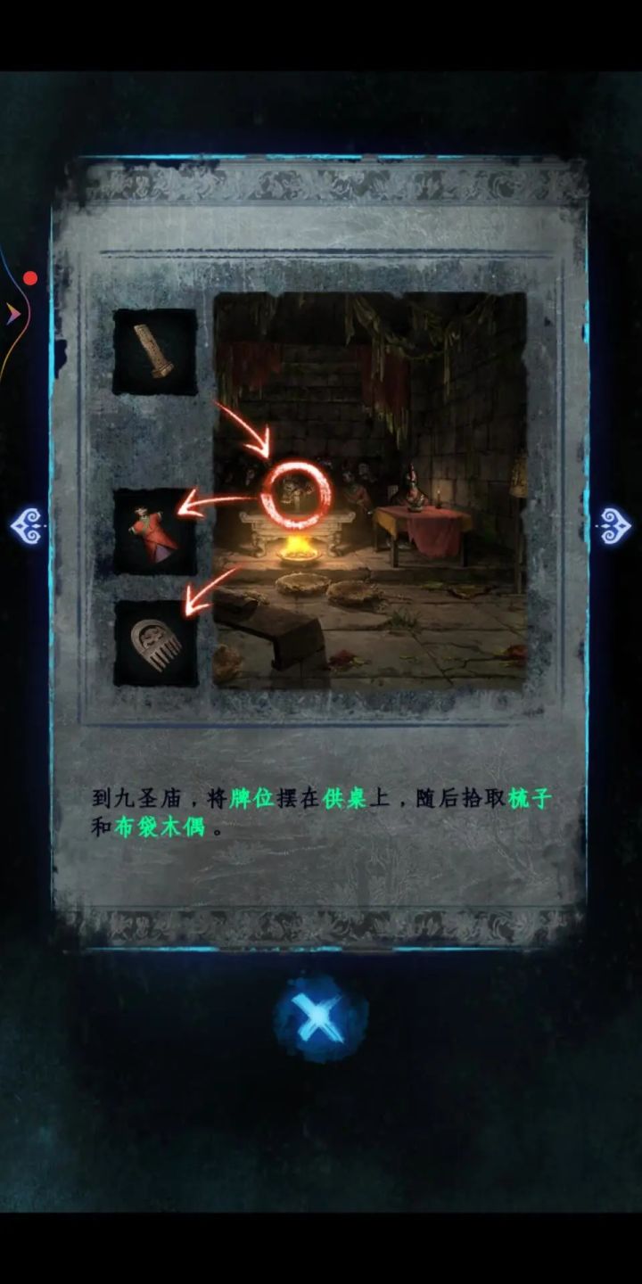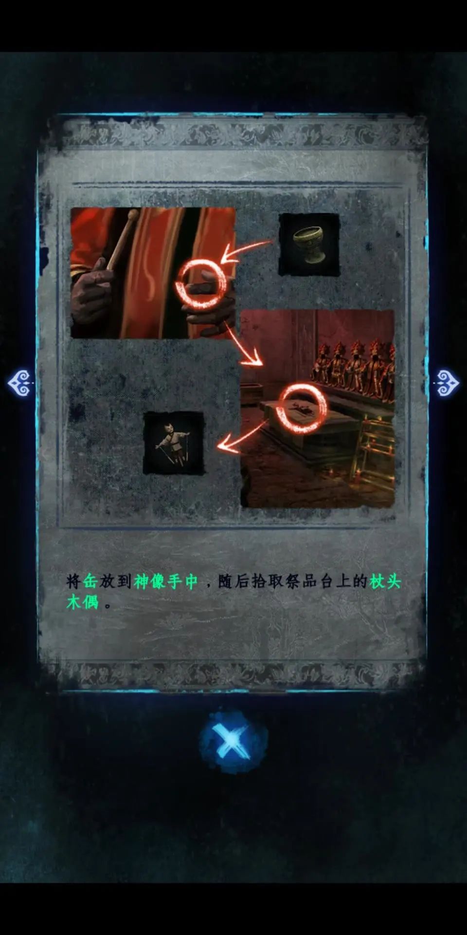 7. 把【人偶】放在车旁红色洞的人偶师手里,将人偶插在刀山上打开左上角小庙门。进入小庙,按蟋蟀腿颜色线索调整左下角香炉,拿到【猪骨头】。用【螺丝刀】处理右边神像上的碎缶,放入【缶】,拿到【小孩人偶】。