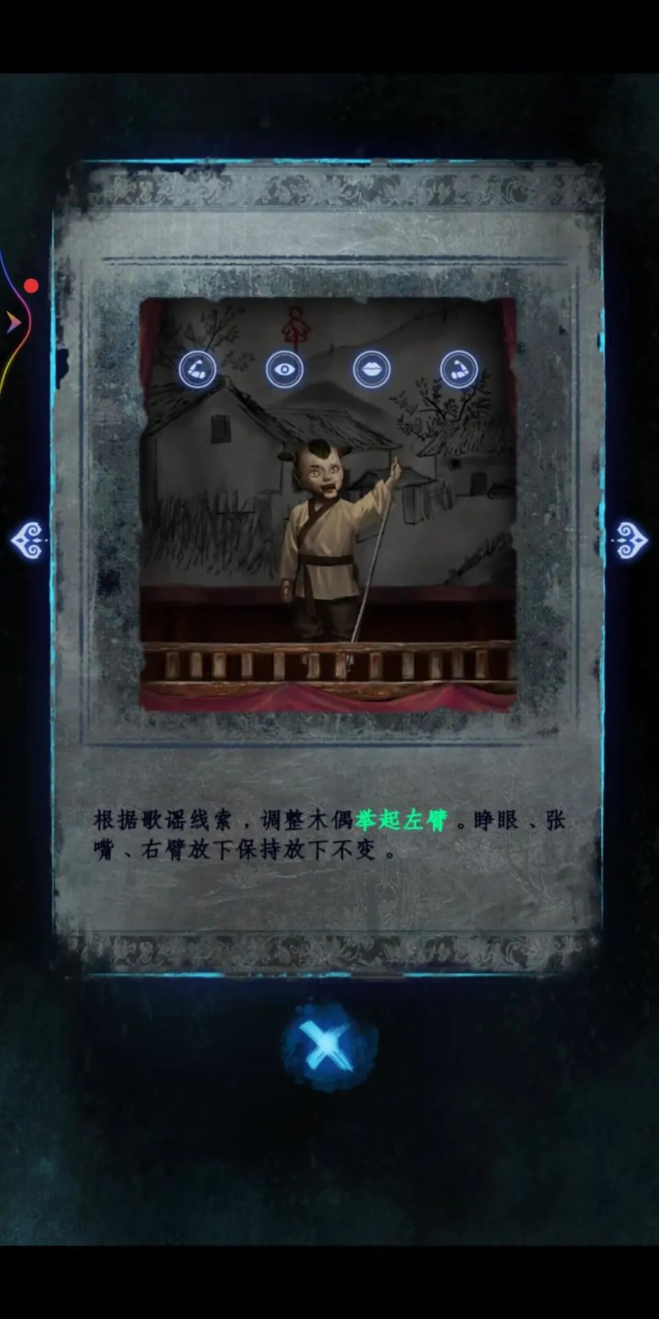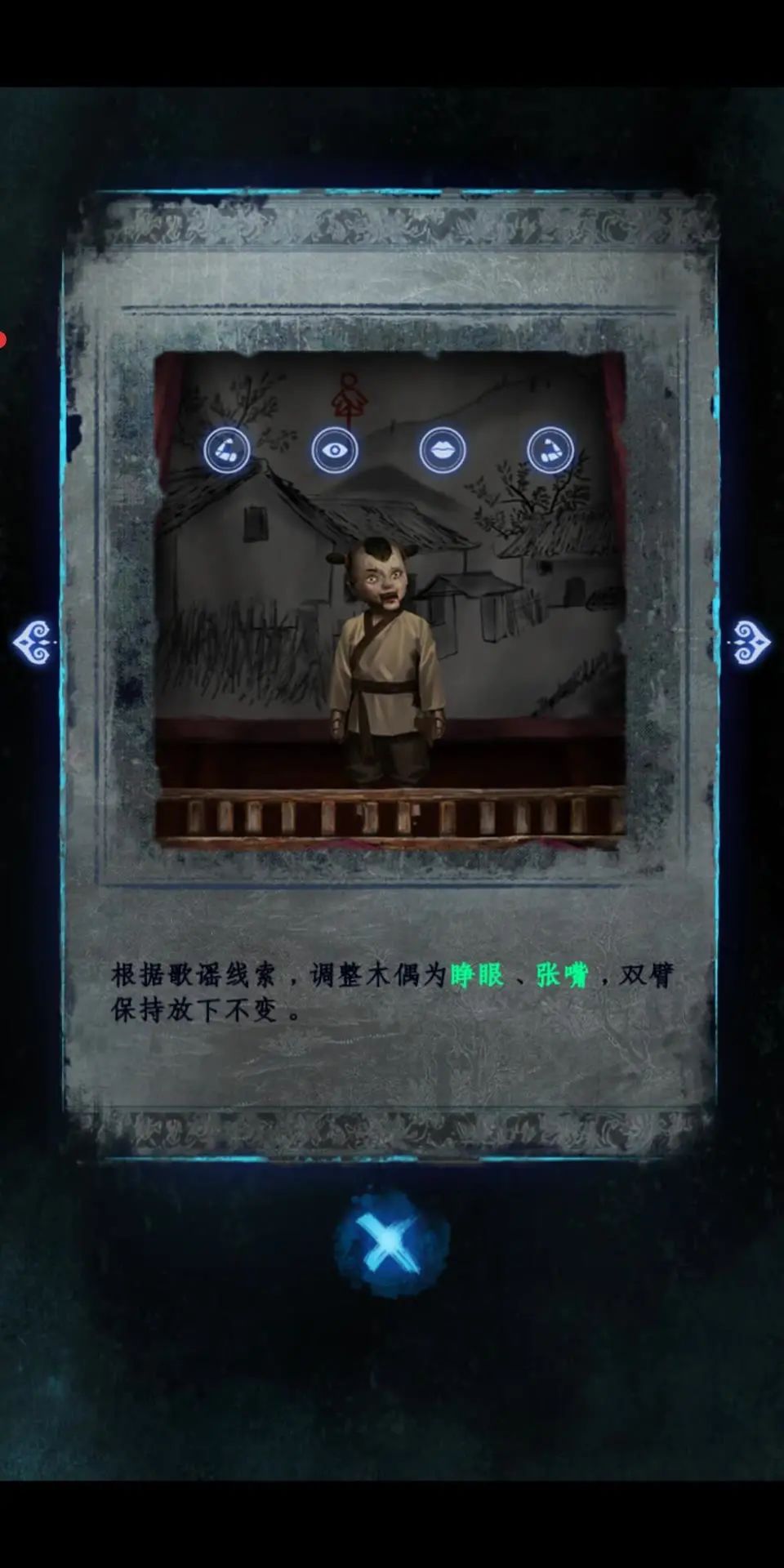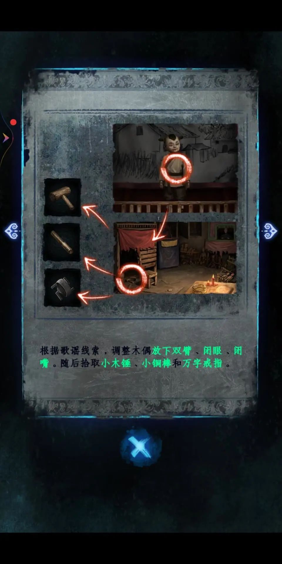 8. 回到车旁,把【小孩人偶】放在左边人偶剧台,按提示依次调整姿态:第一次点【眼睛、嘴】;第二次点【右边的手、眼睛、嘴】;第三次不点,拿到【小木锤】【小铜棒】【卍字戒指】。