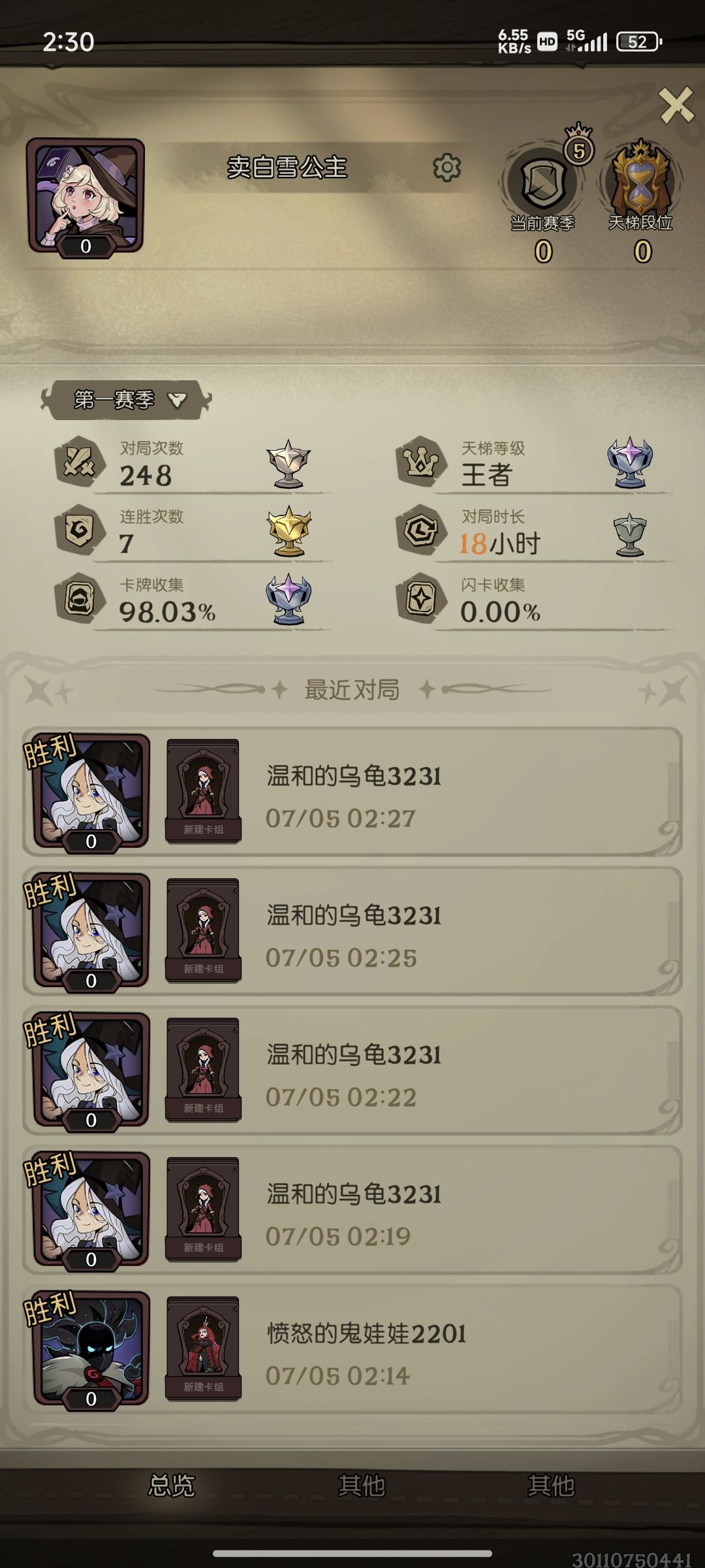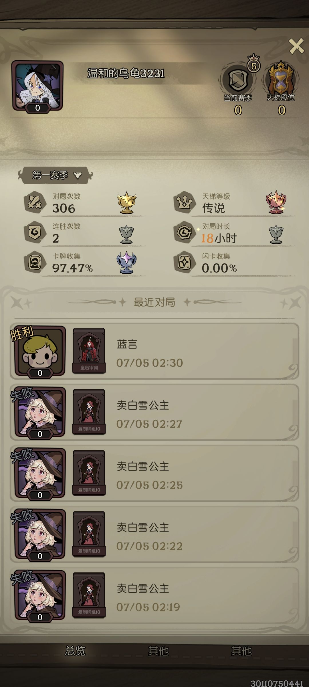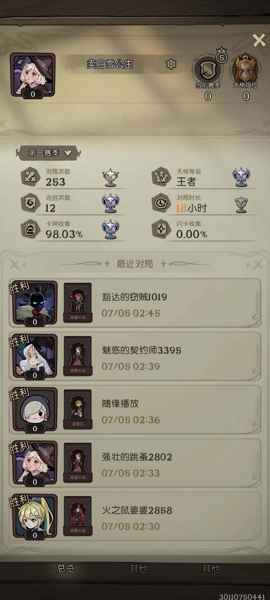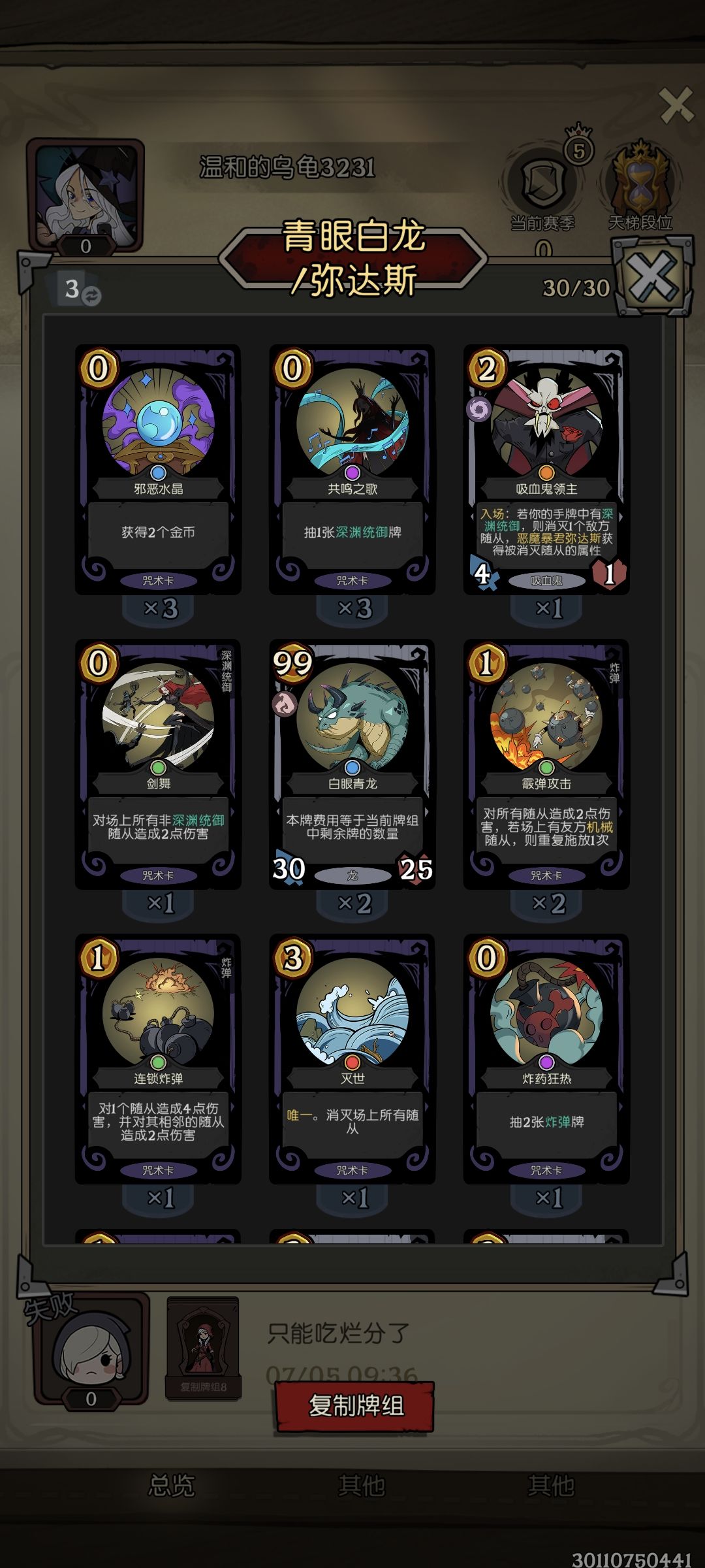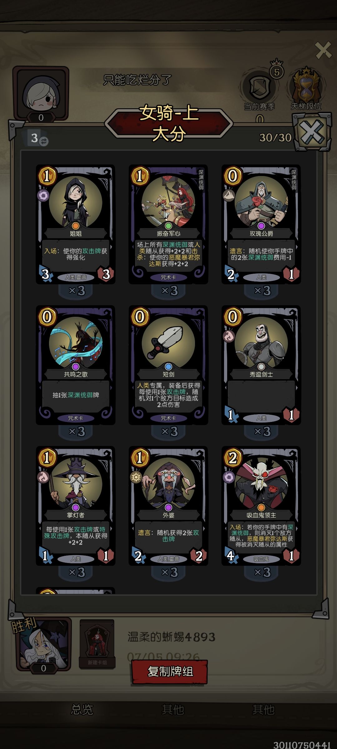 ,中间也遇到过几家快攻龙,但还是找到掌灯就赢,找不到去世,还有玩机械的,也是启动挺快,有输有赢,最离谱的是连续3把遇到同一家女巫,每次都慢一步启动,鉴于王者段了,试错成本太高就没转女巫,一直玩的女骑(现在虽然传说不掉分了,但遇不到玩女巫的了