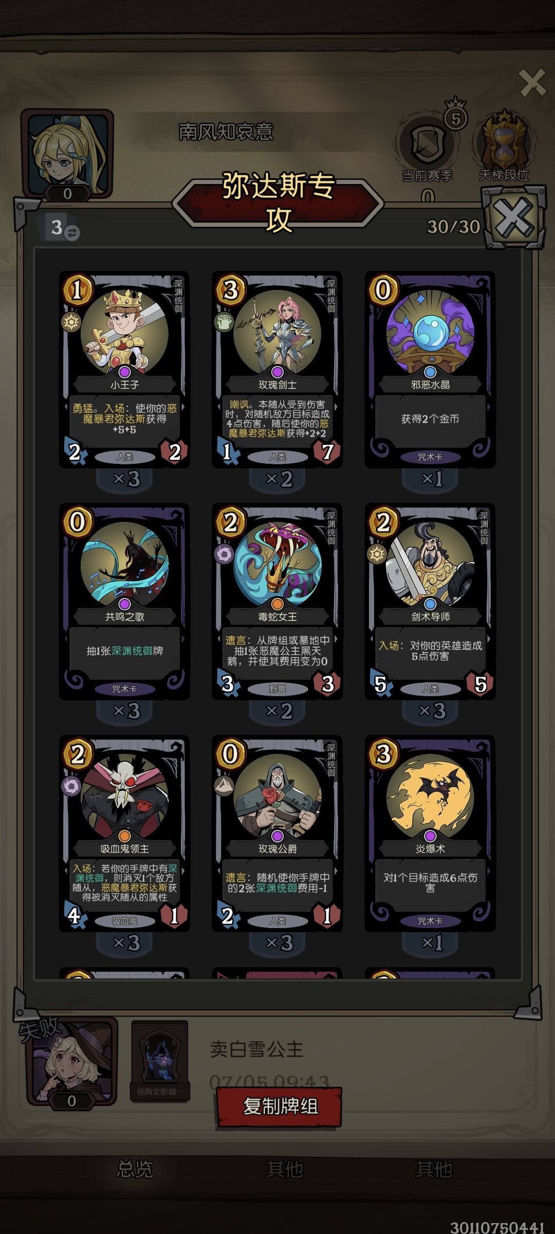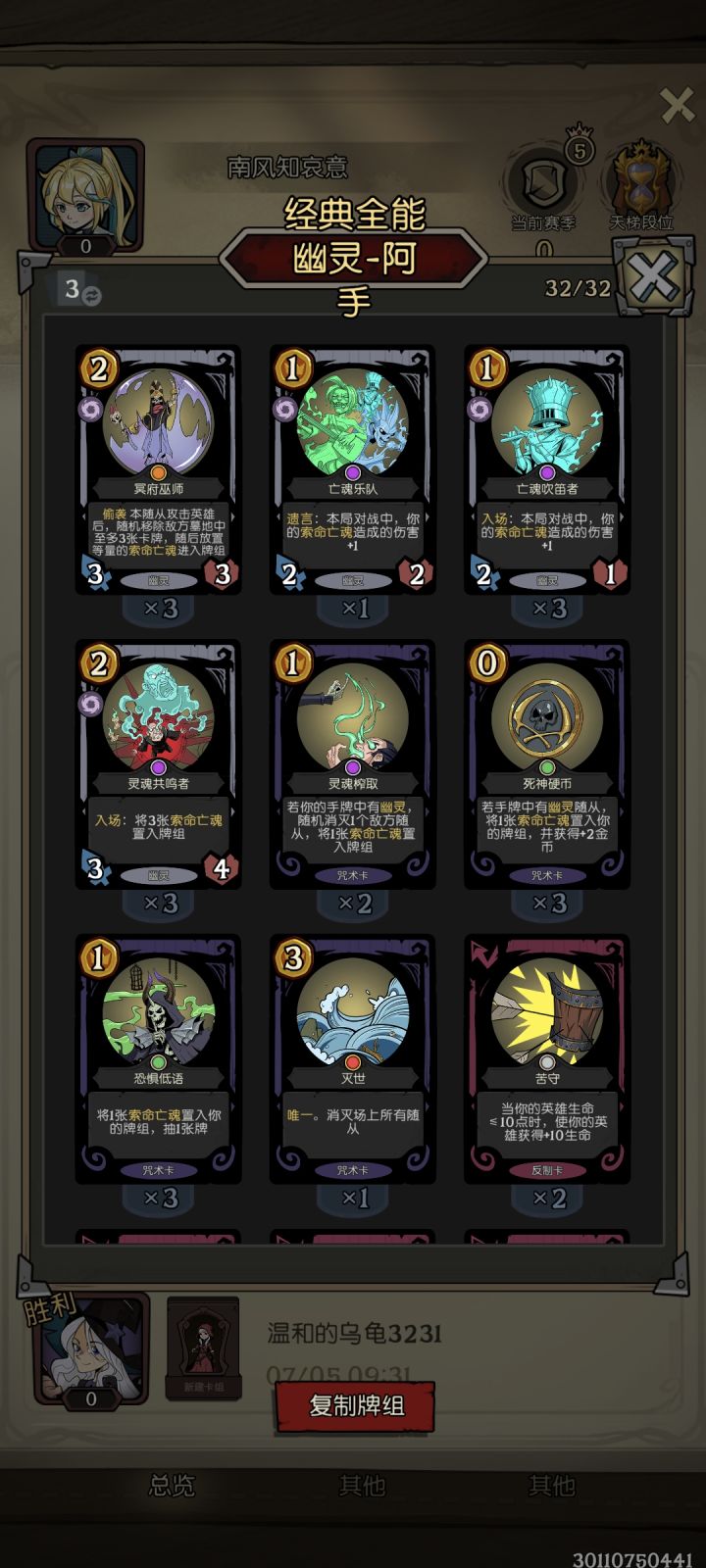 之后转战玩不动皇后,上了个小段到大师,可皇后有很多清场的卡牌,而且有的还是速攻皇后,很容易暴毙,不动皇后也就图一乐(而且昨天还是今天还被削了一刀,入场:攻击力变为0->入场:攻击力变为1,这不纯废了)