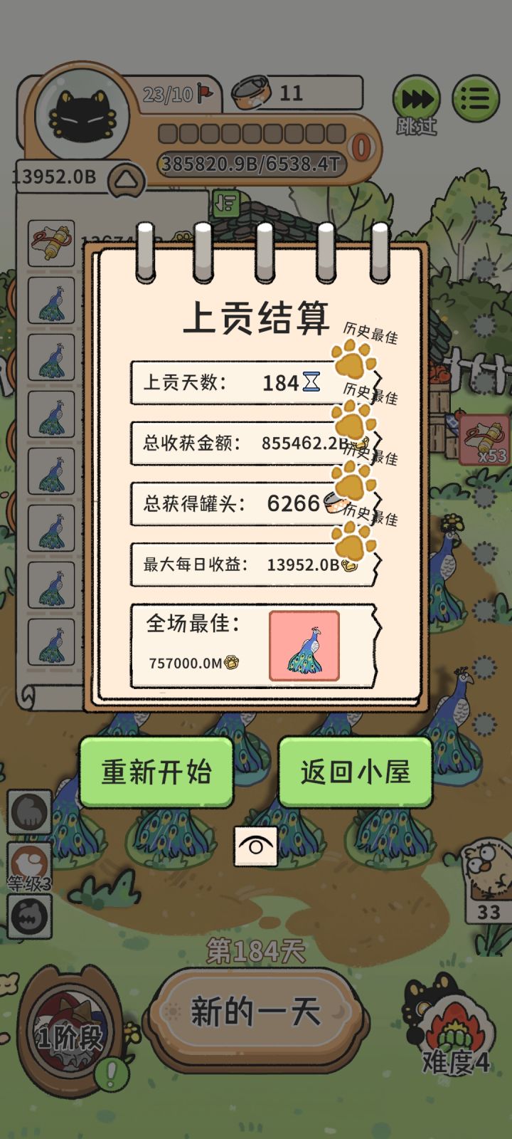 由于基础模式可以SL(没玩过电脑版,感觉挑战模式是不能SL的),改良了下论坛里大佬的思路,主角小丑,初期有蹄养猪流,小丑技能变老虎,把有蹄的全喂给老虎,再老虎变孔雀,然后升满鸟类天赋和多买巢穴,孔雀繁殖多了以后选好时机喂恐怖鸟,最好阶段结束时场上只有一只恐怖鸟,然后商店找幻影宝石恐怖鸟变孔雀,孔雀繁殖再喂恐怖鸟,一直循环,直到单只孔雀到达上限1000M,整个过程中多买秘籍,孔雀到上限后把秘籍以外道具全卖了,用秘籍刷金币就完了