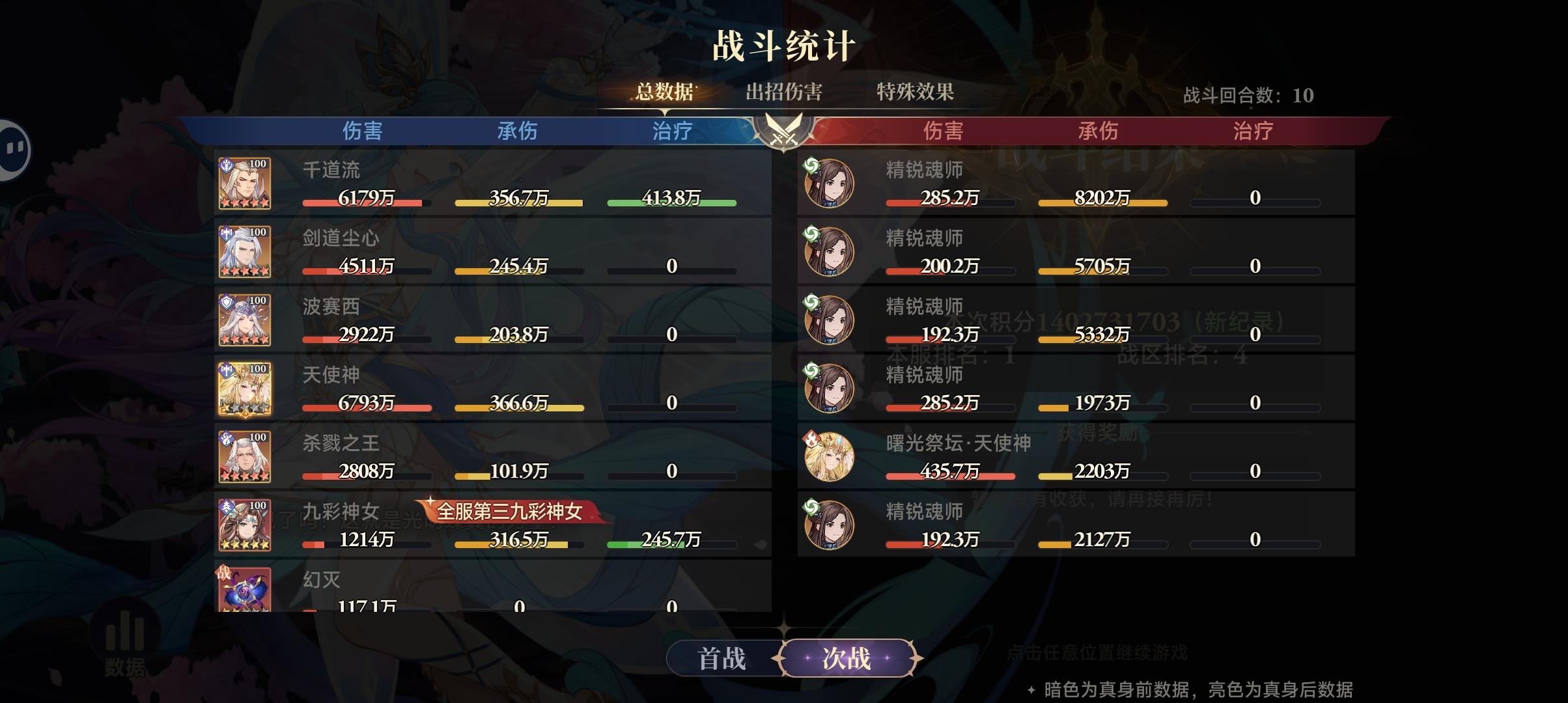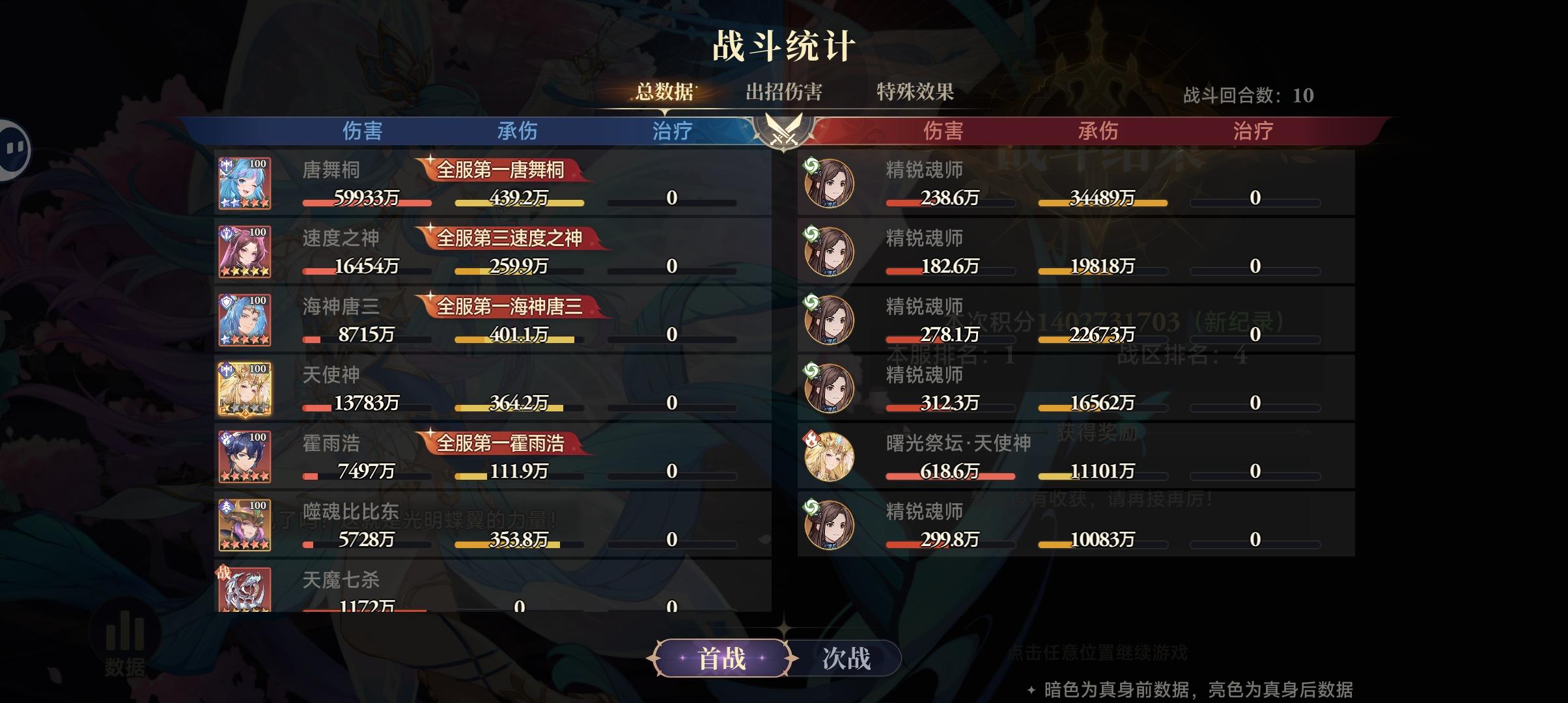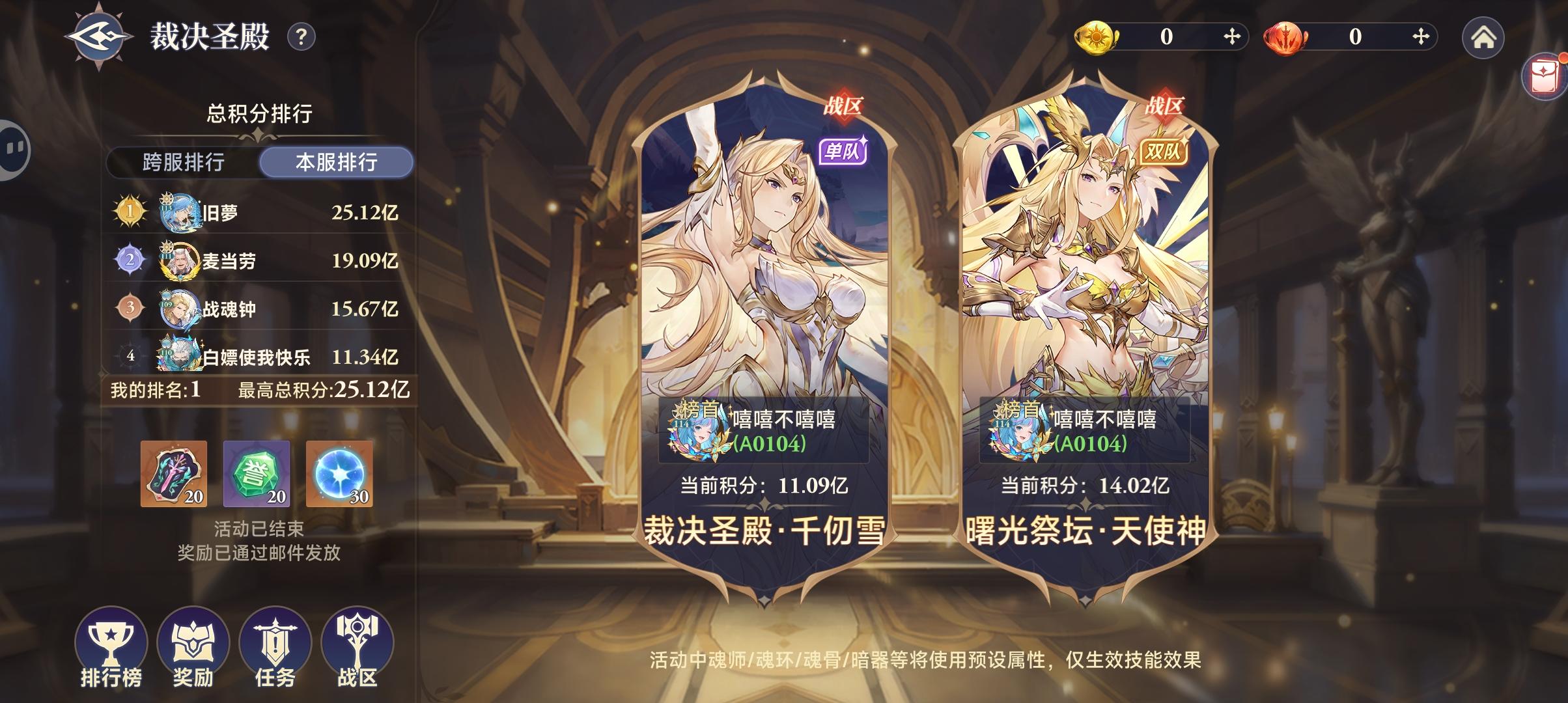这期天使神活动稍微记录一下,水一期。天使神没抽,只有一星也没有武魂,整体打伤害还是很可观的,拿到了跨服第五名,平民玩家每天当收菜就行了