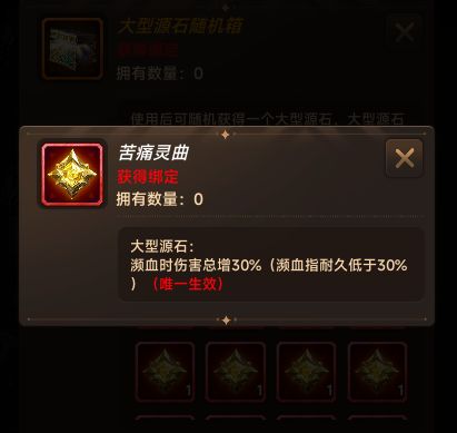 源石是流派构建的基石,BD基本都会围绕源石的效果进行放大和构建,如下面这颗源石可以搭配用耐久开启光环的源石词缀常驻濒血,使总增伤害效果一直生效,类似的组合还有很多供玩家们自己开发了