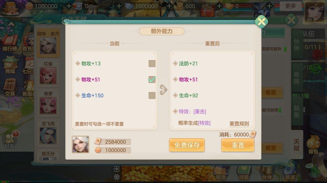 少侠达到指定等级后,可重置伙伴的属性与技能。若重置出优秀的属性,锁定该属性能够大幅节省养成时间。