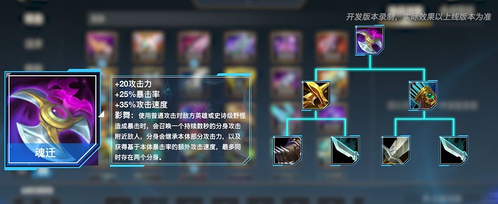 增加攻击力、暴击率与攻击速度。被动:影舞,普通攻击对敌方英雄或史诗野怪造成暴击时,召唤一个临时的分身协助作战,分身继承本体的部分属性,但无法施加攻击特效,且最多存在2个。