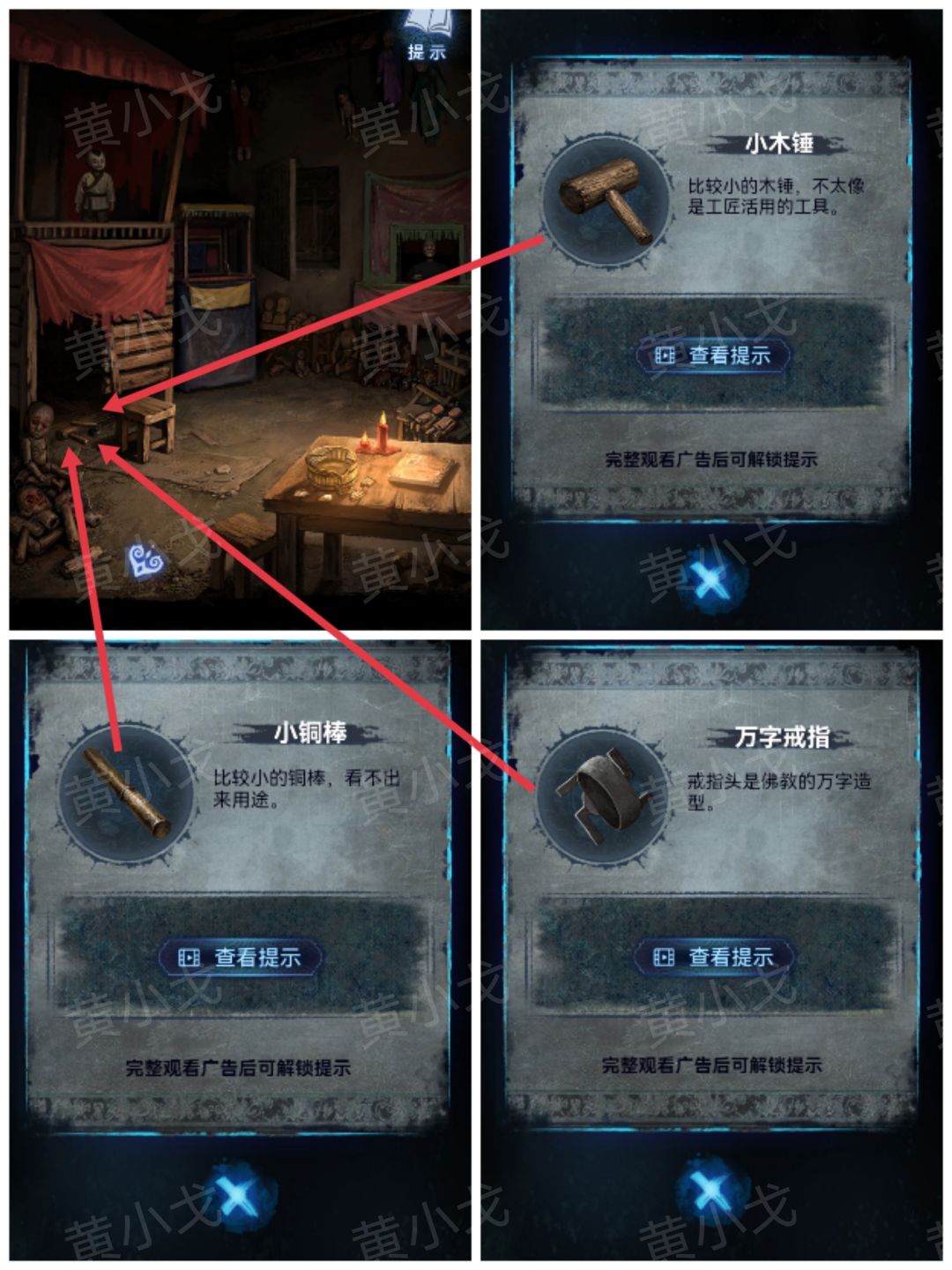 29.点击神龛,用【万字戒指】和【太极戒指】打开上面的两个锁,获得【铁枝木偶】