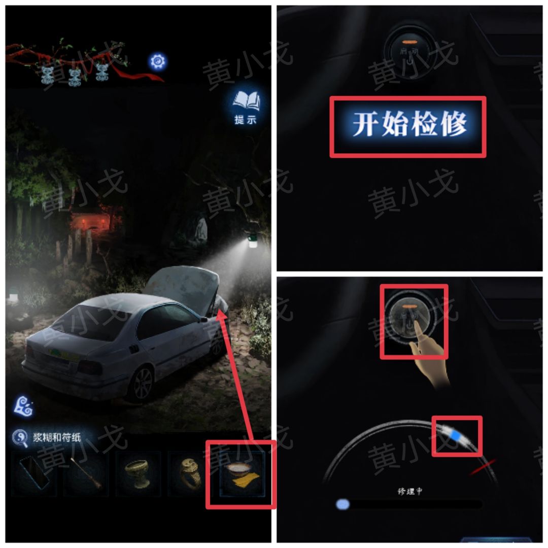 15.点击墙上的机关,根据《鬼術篇悟》上的线索和[车]场景通过手机观察树林得到的线索,调整机关