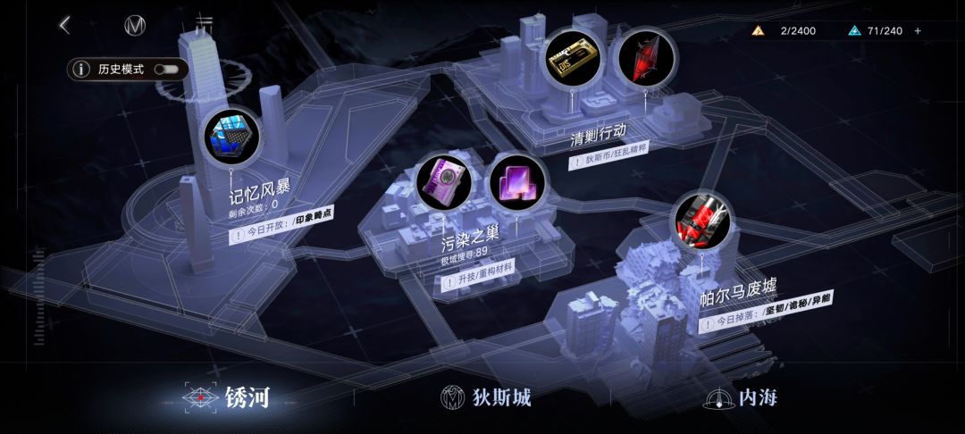 狄斯:各类关卡与副本的入口,分为“锈河”、“狄斯城”、“内海”三个区域