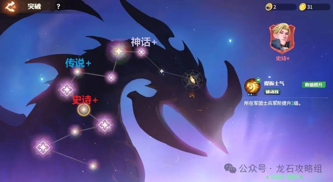 这里推荐取得3个档位与前面的输出有非常大的不同:,史诗+,传说+,神话+。前两档直接提升兵种阶数,收益大。神话+升级1技能,神话+这档的会使得生存能力大幅度提升,回复生命上限(总血量)的40%。