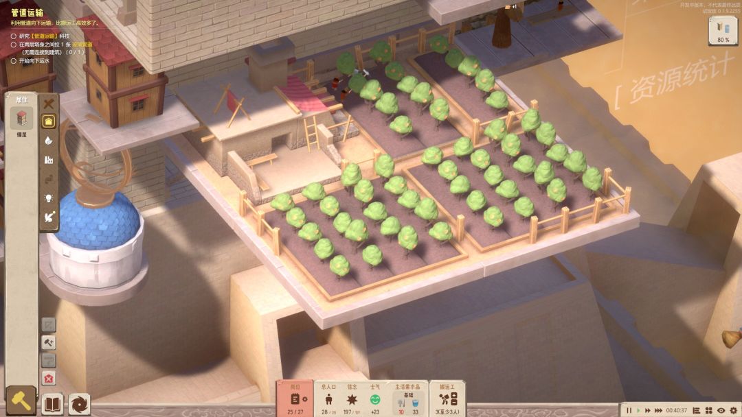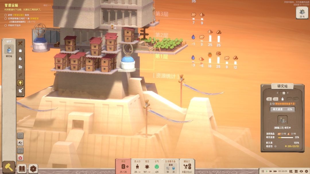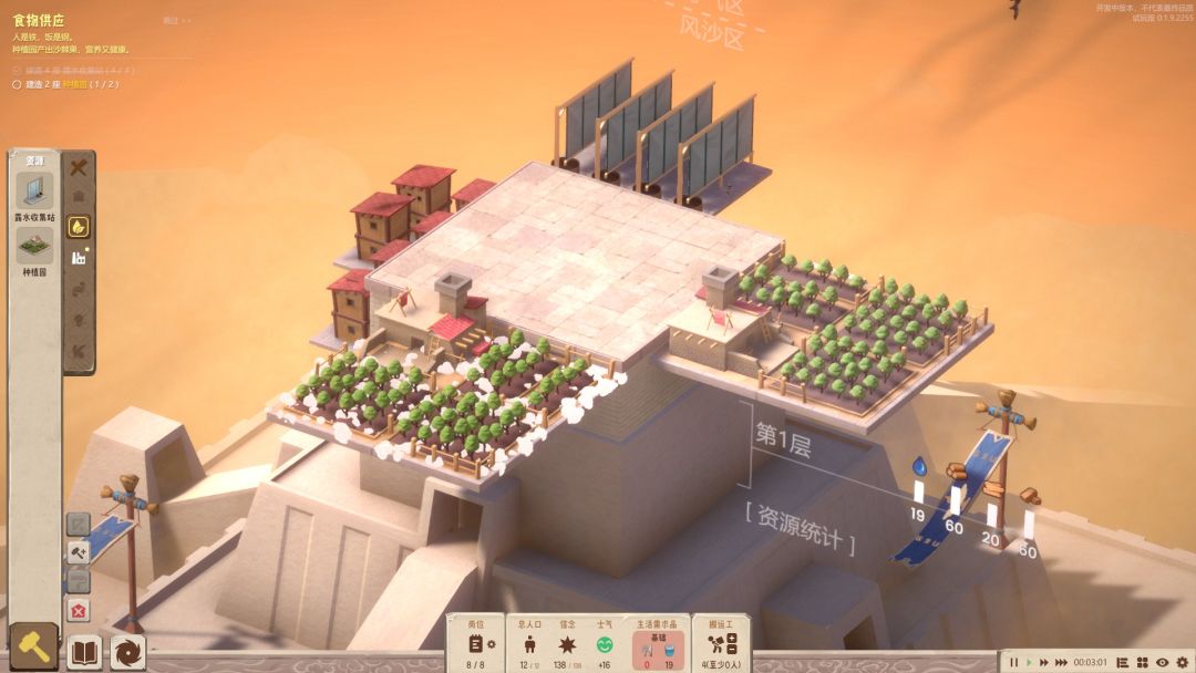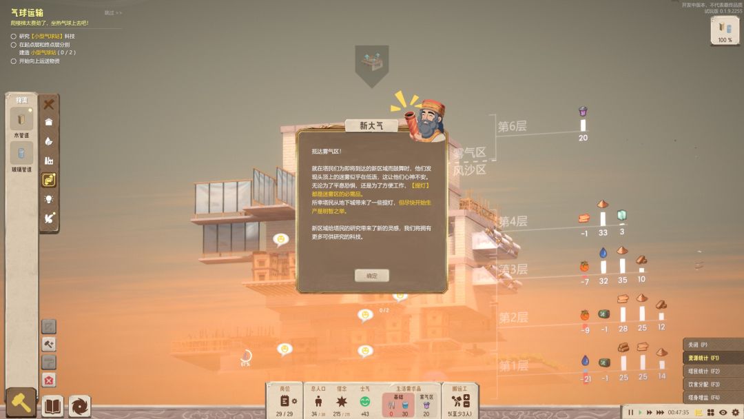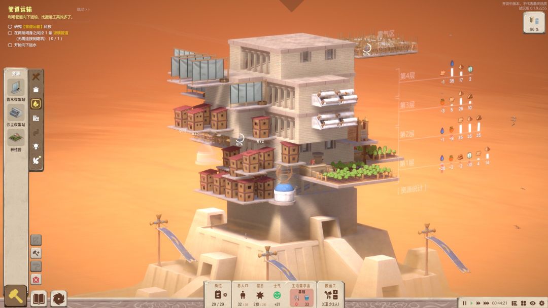 《巴别塔:垂直国度》是一个后末日背景城市建筑游戏。在在建造逻辑方面,本作倒是跟其他建筑游戏大同小异:通过安排住所,例如棚屋,就能自动增加人口;通过建设资源收集设施,例如露水收集站、沙尘收集站等,才能增加资源;通过建造加工设施来把基础资源转换成高级资源,例如木材厂可以把木头转换为木材;通过研究科技,解锁更多的建筑……相信只要是经常玩城市建模类游戏的玩家,都可以轻松上手。
