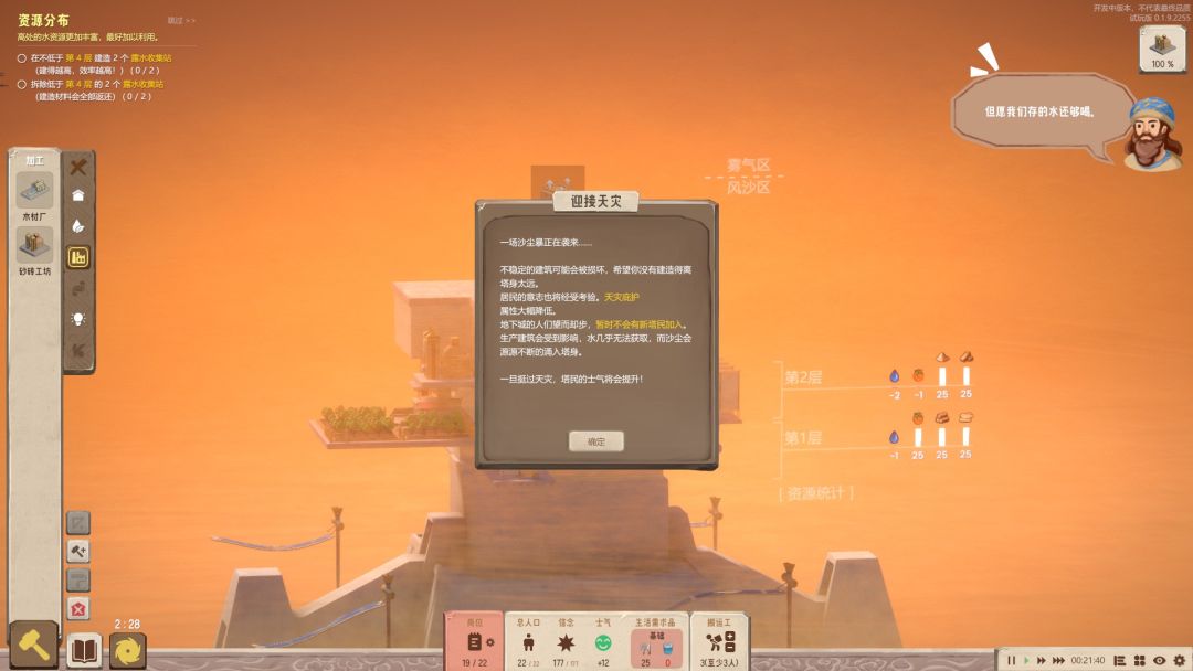 在游戏中,我们会遭遇天灾。当天灾来临时,塔民的天灾庇护属性会大幅降低,并且不会有新的塔民加入。生产建筑方面,水资源会无法收集,但沙尘却能得到加速收集。在天灾中,可能会损失塔民,比如遇见的第一个天灾,沙尘暴会把塔民吹飞,造成人口衰减。尽量减少天灾损失,能让整个高塔发育的更加健康。另外,一旦挺过天灾,不仅能得到一些资源馈赠,还能让塔民的士气得到提升。