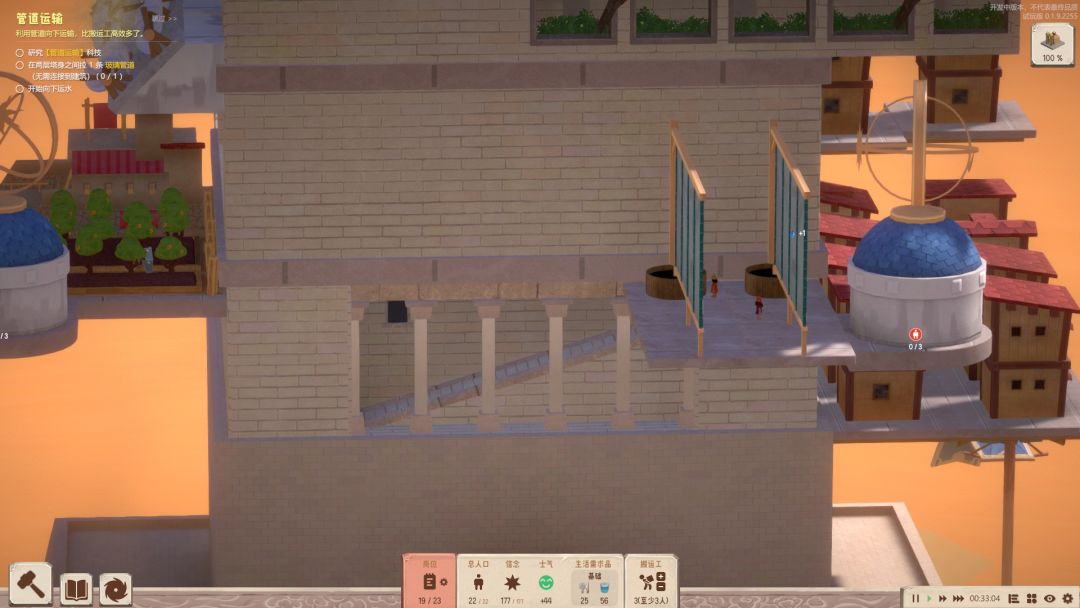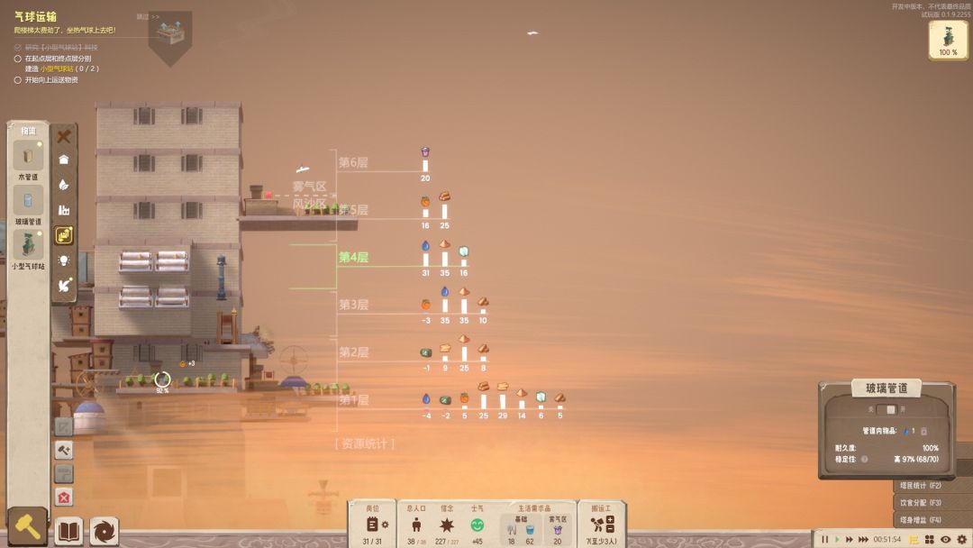 在这个游戏中,不同塔层的资源是分开统计的,例如第一层里可能水资源匮乏,而在第四层里却水资源充沛。为了协调不同塔层的资源分布,玩家可以安排搬运工来每层里的多余资源搬运到其他需要的地方。当然,搬运工都是人,是人的话,速度就很慢。这个时候,玩家可以使用水管来向下运输资源,或者利用气球站来向上运输资源。这游戏对于资源的管理卡的很严,玩家如果不能及时平衡各项资源的话,很容易造成卡关。