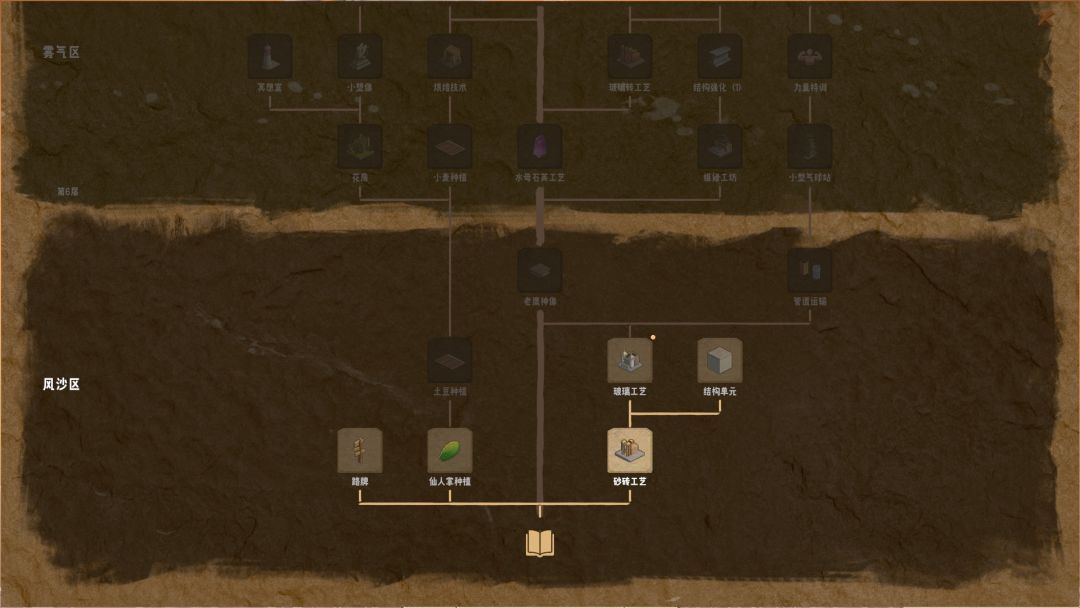 从低到高,依次是风沙区、雾气区、雨水区、冰雪区、晴空区、星空区。在不同的区域,有着不同的特点,例如风沙区常年被风沙侵扰,雾气区常年有迷雾。玩家需要使用不同的科技来适应不同的区域,例如,使用提灯就可以驱散雾气区的迷雾,而建造水母湾可以生产提灯。