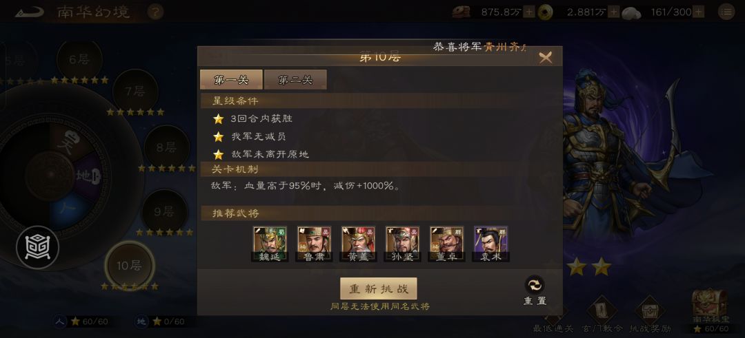我们的伤害被全部稀释,本关卡需要上阵拥有群伤和多段伤害的武将,每次伤害我们都能打掉敌军1%的血量。